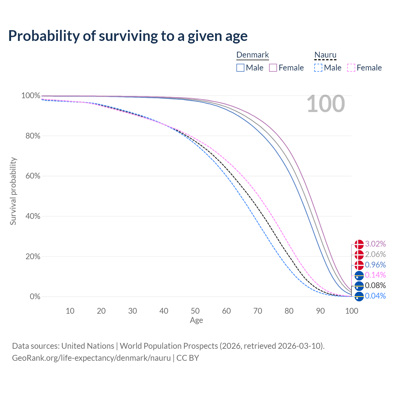 This life expectancy calculator shows the odds of living to 100, 95, 90, and below based on current age for both males and females in Denmark and Nauru, along with mean and median age of death. The calculations are based on the 2026 life tables (actuarial tables) from the UN World Population Prospects.