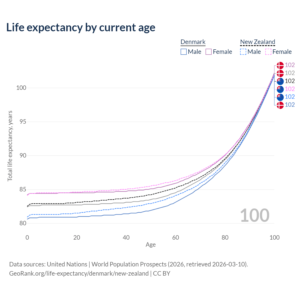 This life expectancy calculator shows the odds of living to 100, 95, 90, and below based on current age for both males and females in Denmark and New Zealand, along with mean and median age of death. The calculations are based on the 2026 life tables (actuarial tables) from the UN World Population Prospects.