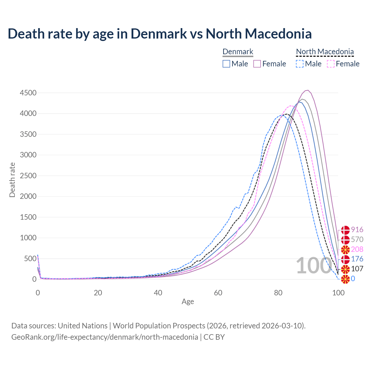 This life expectancy calculator shows the odds of living to 100, 95, 90, and below based on current age for both males and females in Denmark and North Macedonia, along with mean and median age of death. The calculations are based on the 2026 life tables (actuarial tables) from the UN World Population Prospects.