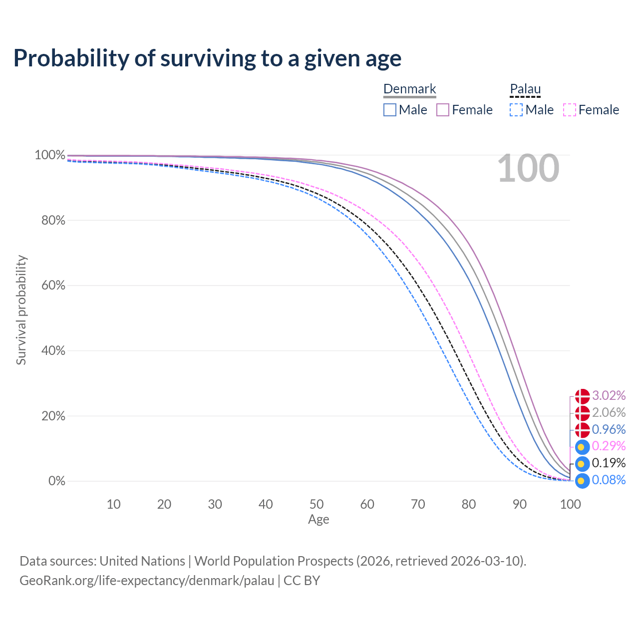 This life expectancy calculator shows the odds of living to 100, 95, 90, and below based on current age for both males and females in Denmark and Palau, along with mean and median age of death. The calculations are based on the 2026 life tables (actuarial tables) from the UN World Population Prospects.