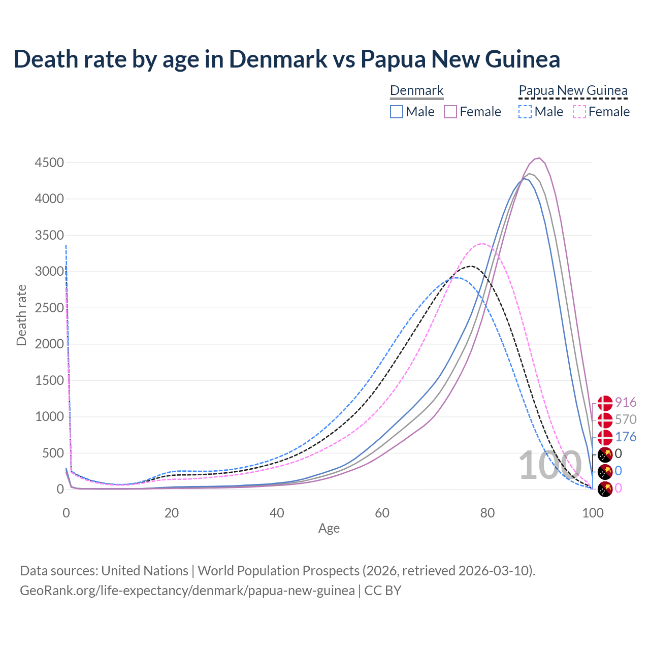 In Denmark, the most common age of death is 88, compared to 0 in Papua New Guinea. The median age of death is 85.2 in Denmark and 71.7 in Papua New Guinea, meaning only half of each cohort is expected to live past that age.