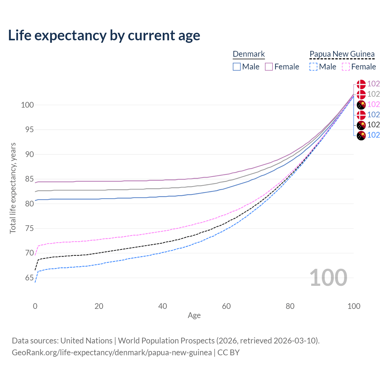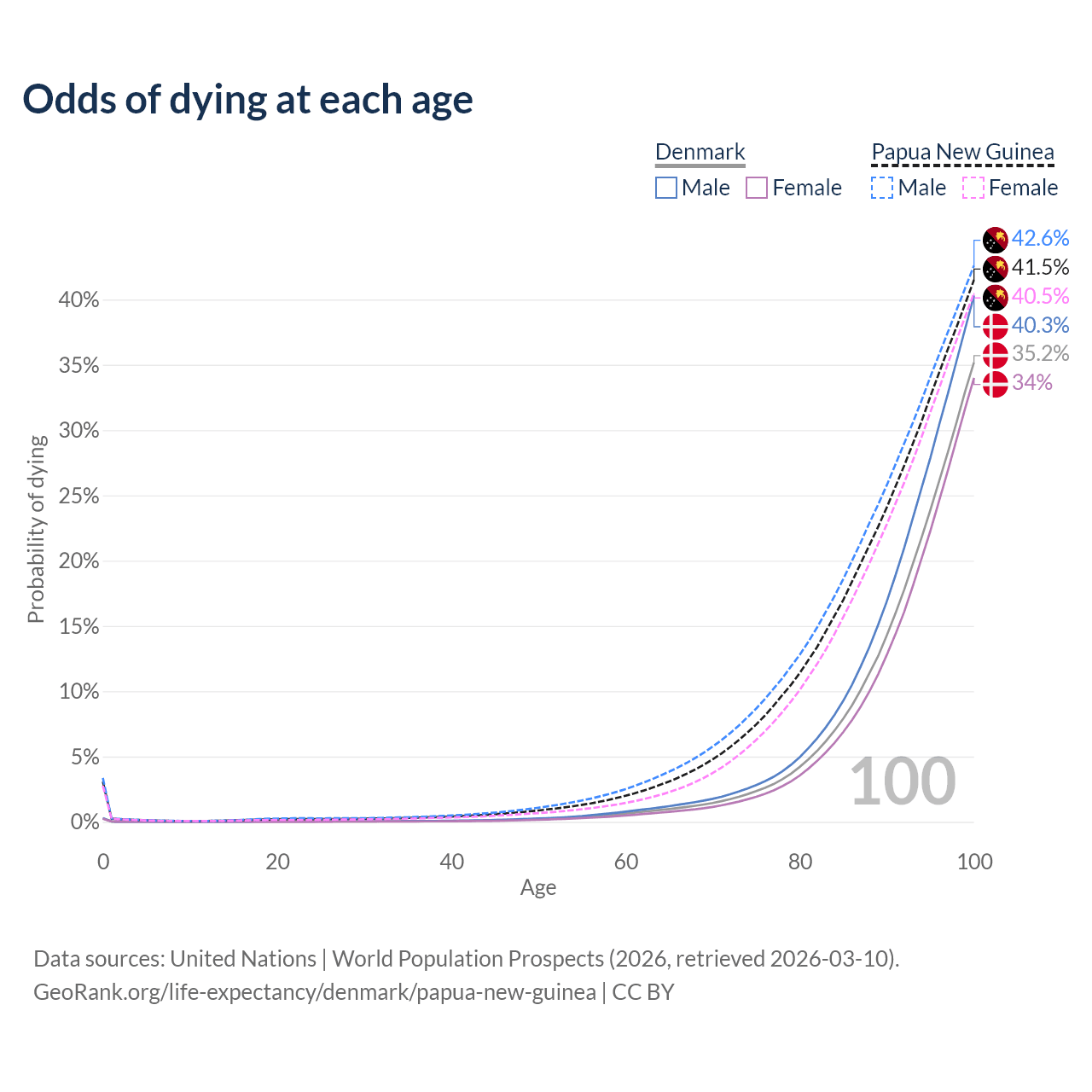 This life expectancy calculator shows the odds of living to 100, 95, 90, and below based on current age for both males and females in Denmark and Papua New Guinea, along with mean and median age of death. The calculations are based on the 2026 life tables (actuarial tables) from the UN World Population Prospects.