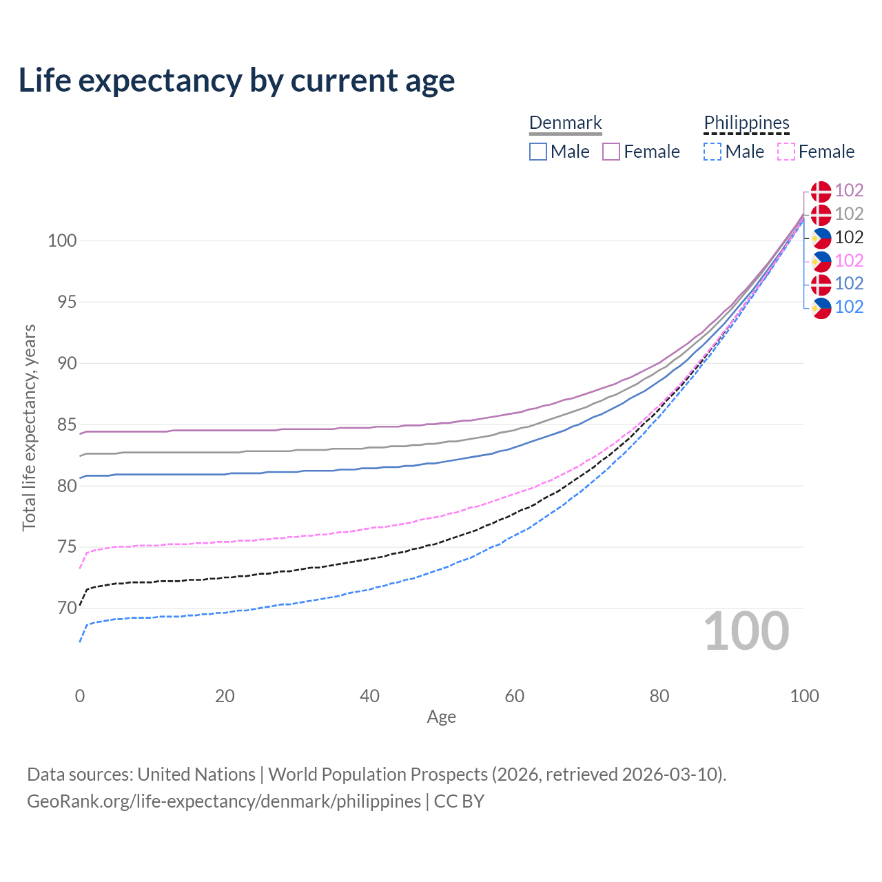 This life expectancy calculator shows the odds of living to 100, 95, 90, and below based on current age for both males and females in Denmark and the Philippines, along with mean and median age of death. The calculations are based on the 2026 life tables (actuarial tables) from the UN World Population Prospects.