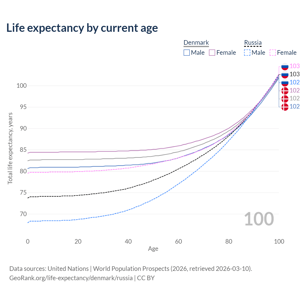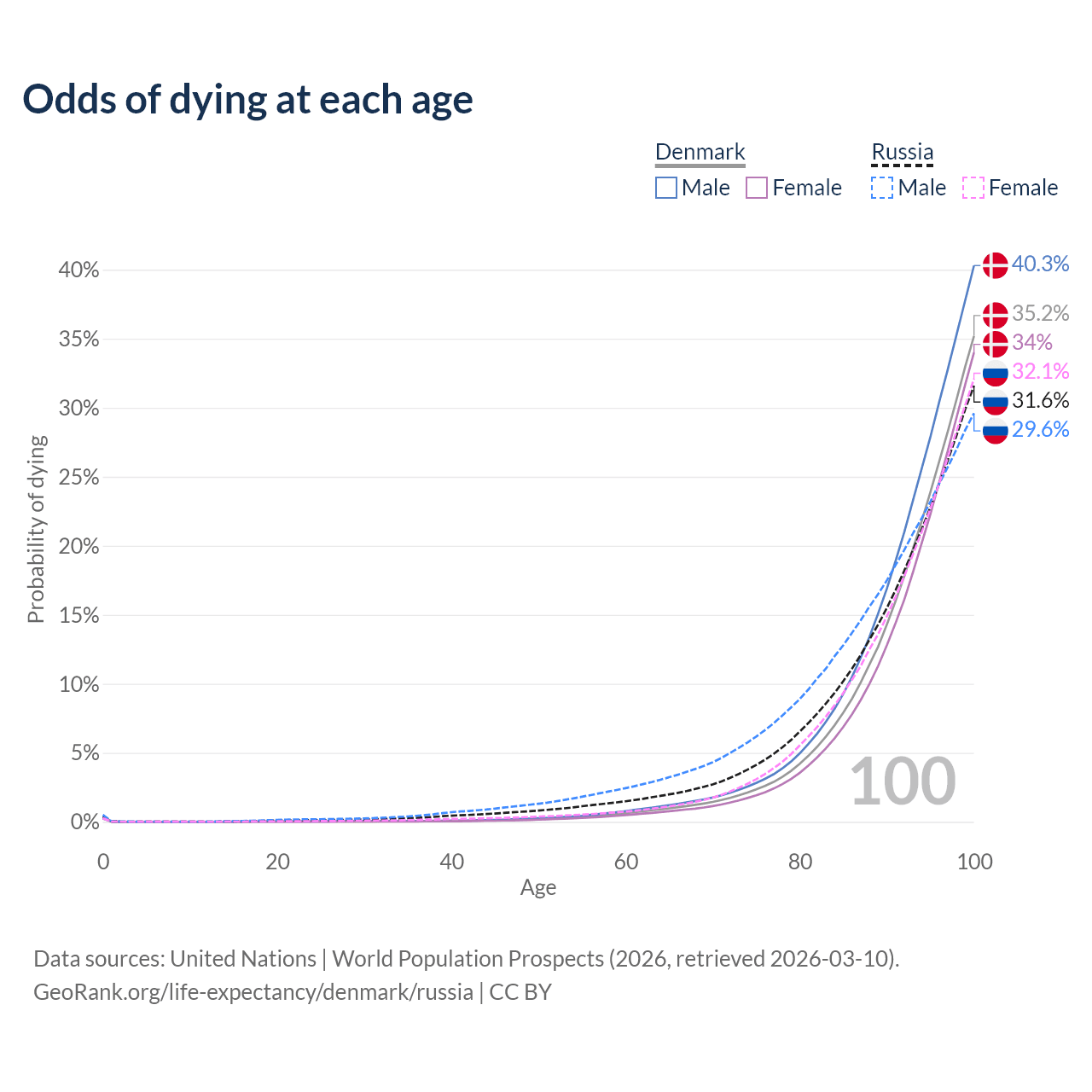 This life expectancy calculator shows the odds of living to 100, 95, 90, and below based on current age for both males and females in Denmark and Russia, along with mean and median age of death. The calculations are based on the 2026 life tables (actuarial tables) from the UN World Population Prospects.