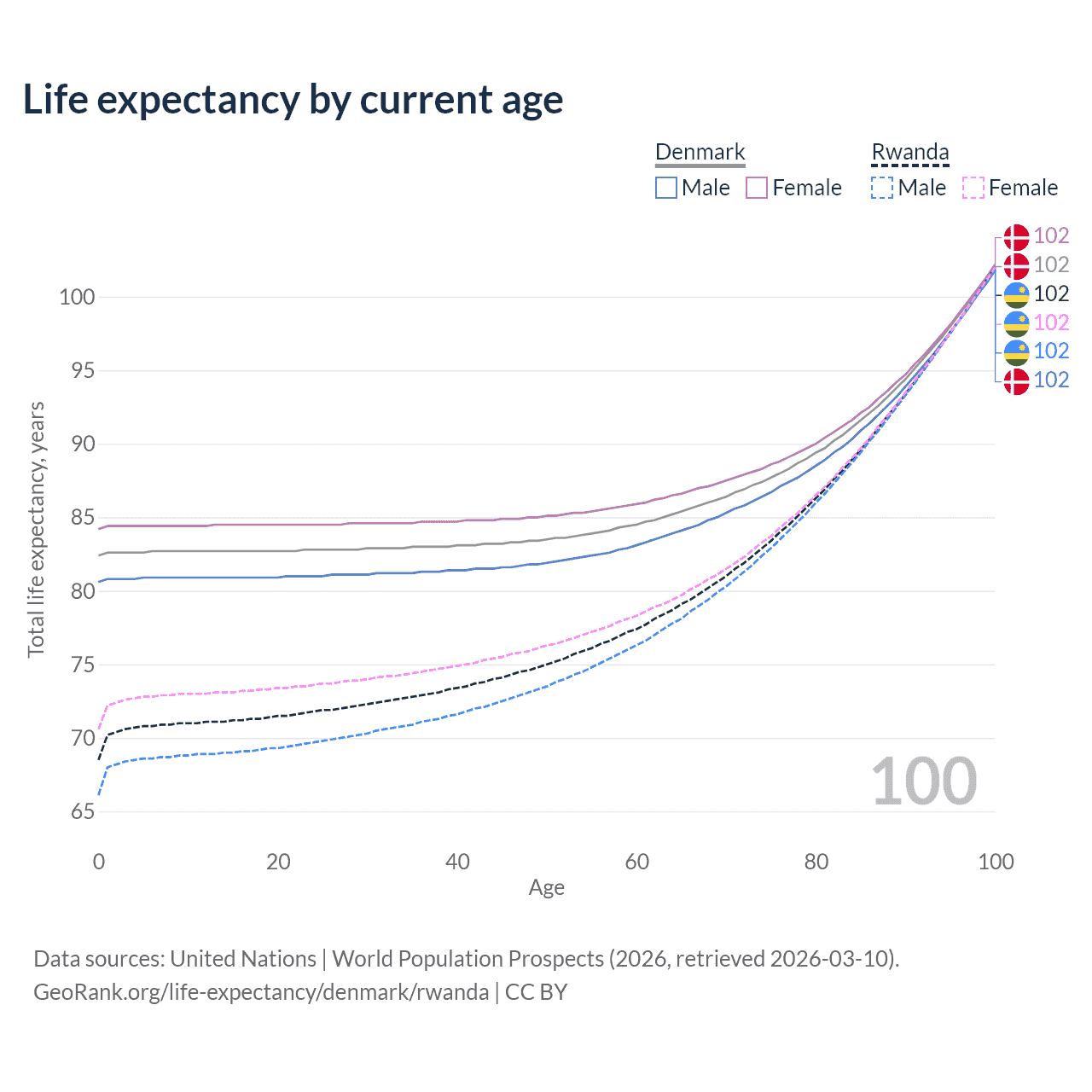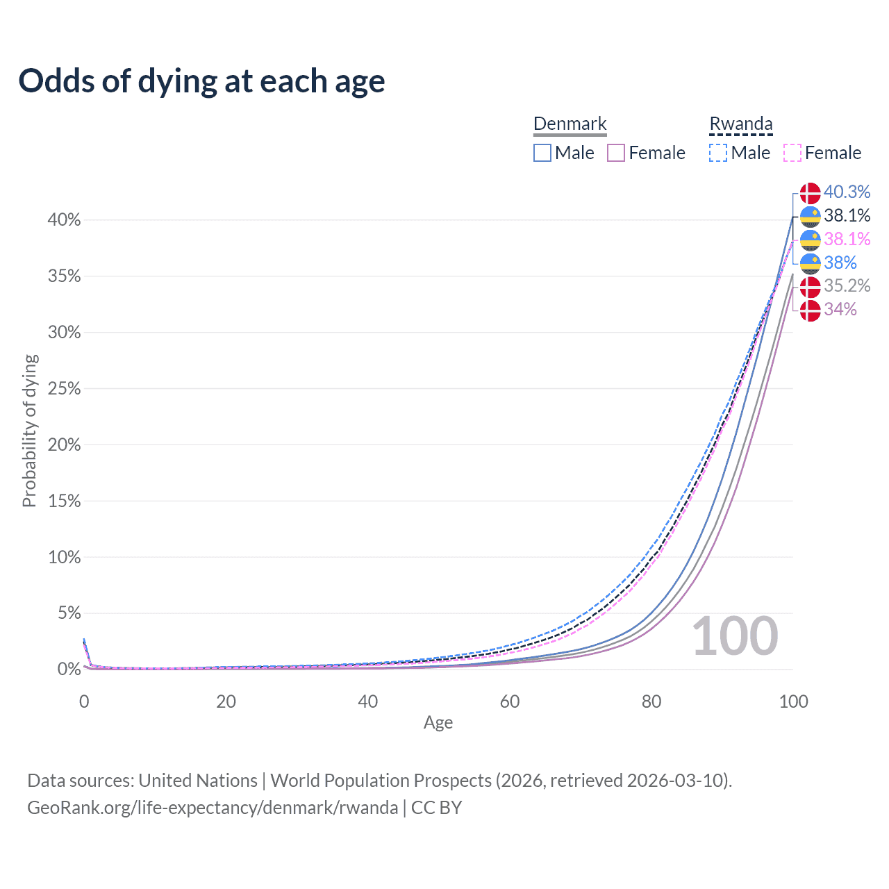 This life expectancy calculator shows the odds of living to 100, 95, 90, and below based on current age for both males and females in Denmark and Rwanda, along with mean and median age of death. The calculations are based on the 2026 life tables (actuarial tables) from the UN World Population Prospects.