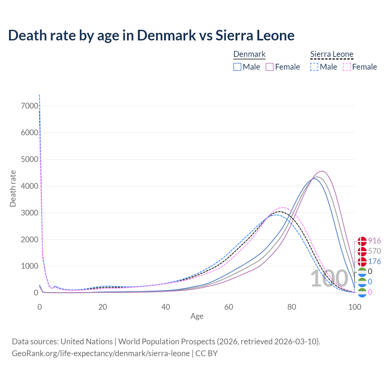 In Denmark, the most common age of death is 88, compared to 0 in Sierra Leone. The median age of death is 85.2 in Denmark and 70.8 in Sierra Leone, meaning only half of each cohort is expected to live past that age.