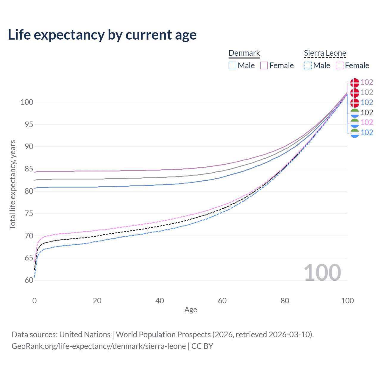This life expectancy calculator shows the odds of living to 100, 95, 90, and below based on current age for both males and females in Denmark and Sierra Leone, along with mean and median age of death. The calculations are based on the 2026 life tables (actuarial tables) from the UN World Population Prospects.