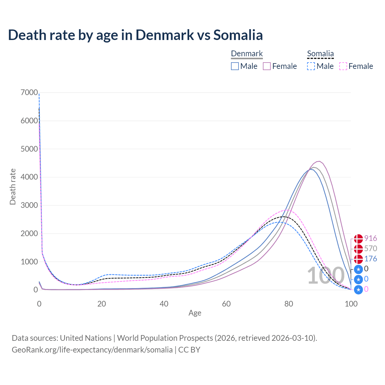 In Denmark, the most common age of death is 88, compared to 0 in Somalia. The median age of death is 85.2 in Denmark and 69 in Somalia, meaning only half of each cohort is expected to live past that age.