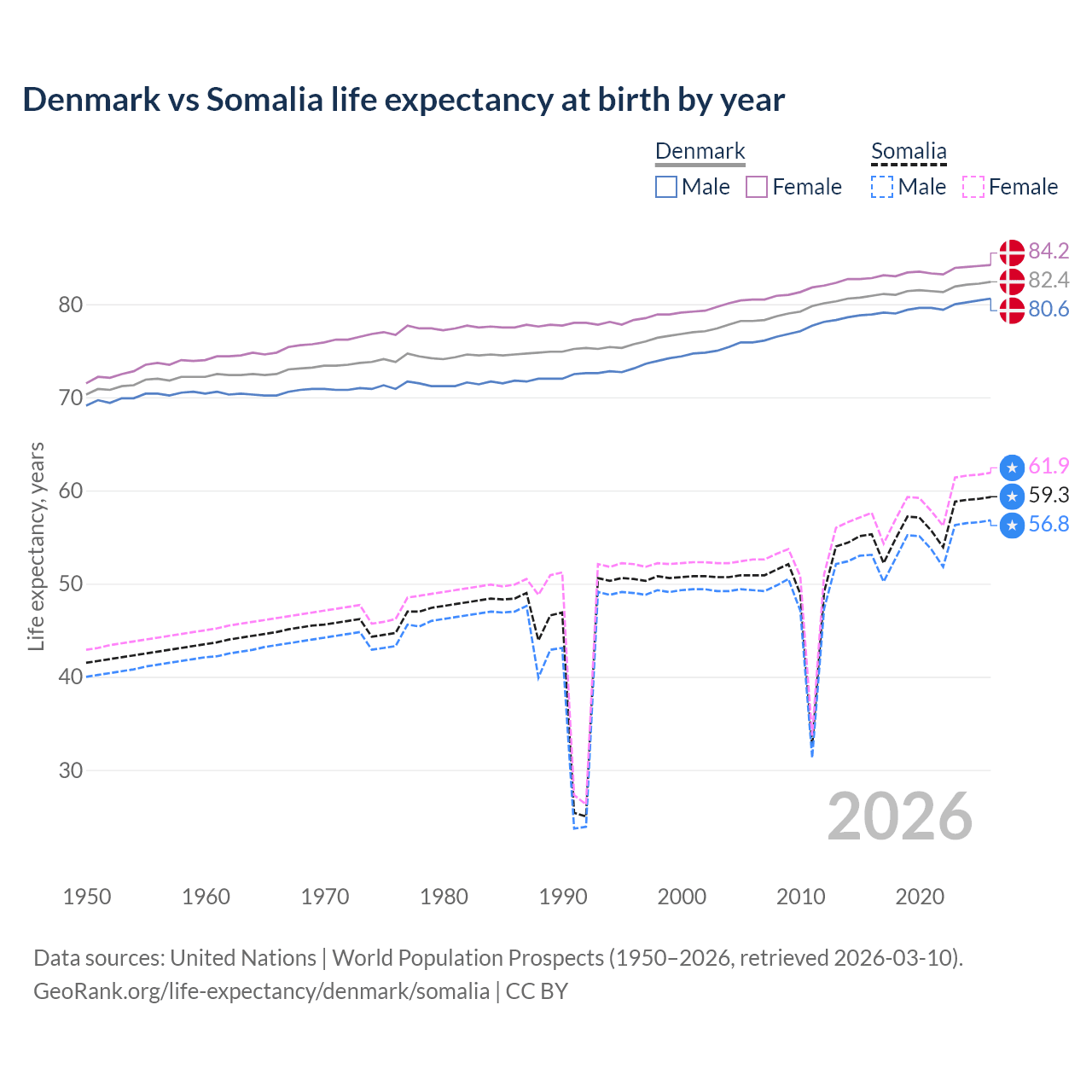 The average life expectancy at birth is 82.4 years in Denmark vs 59.3 in Somalia. Denmark is ranked 31/197 by life expectancy, and Somalia is 192/197. In Denmark, the life expectancy is 80.6 years for males and 84.2 years for females. In Somalia, it's 56.8 years for males and 61.9 years for females.