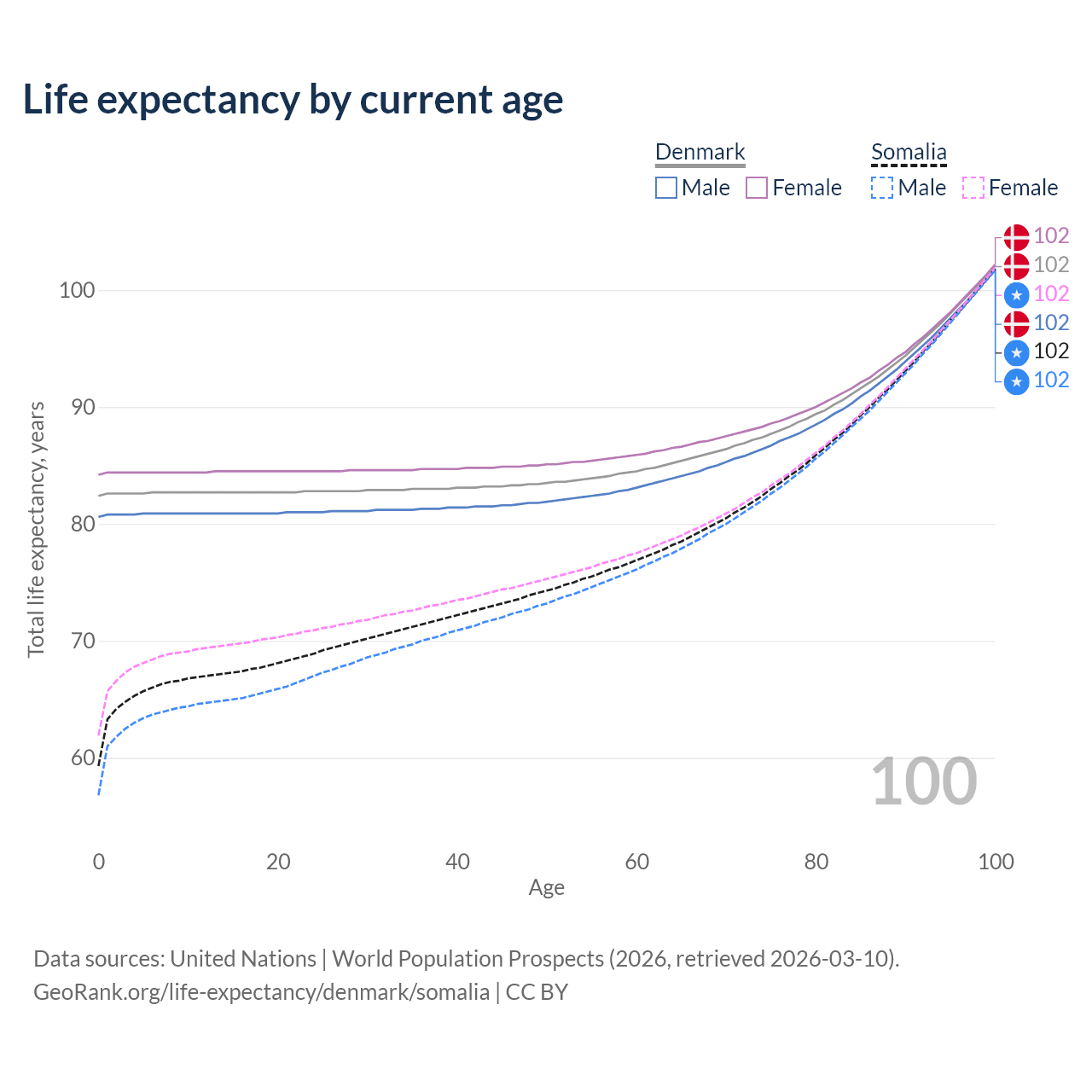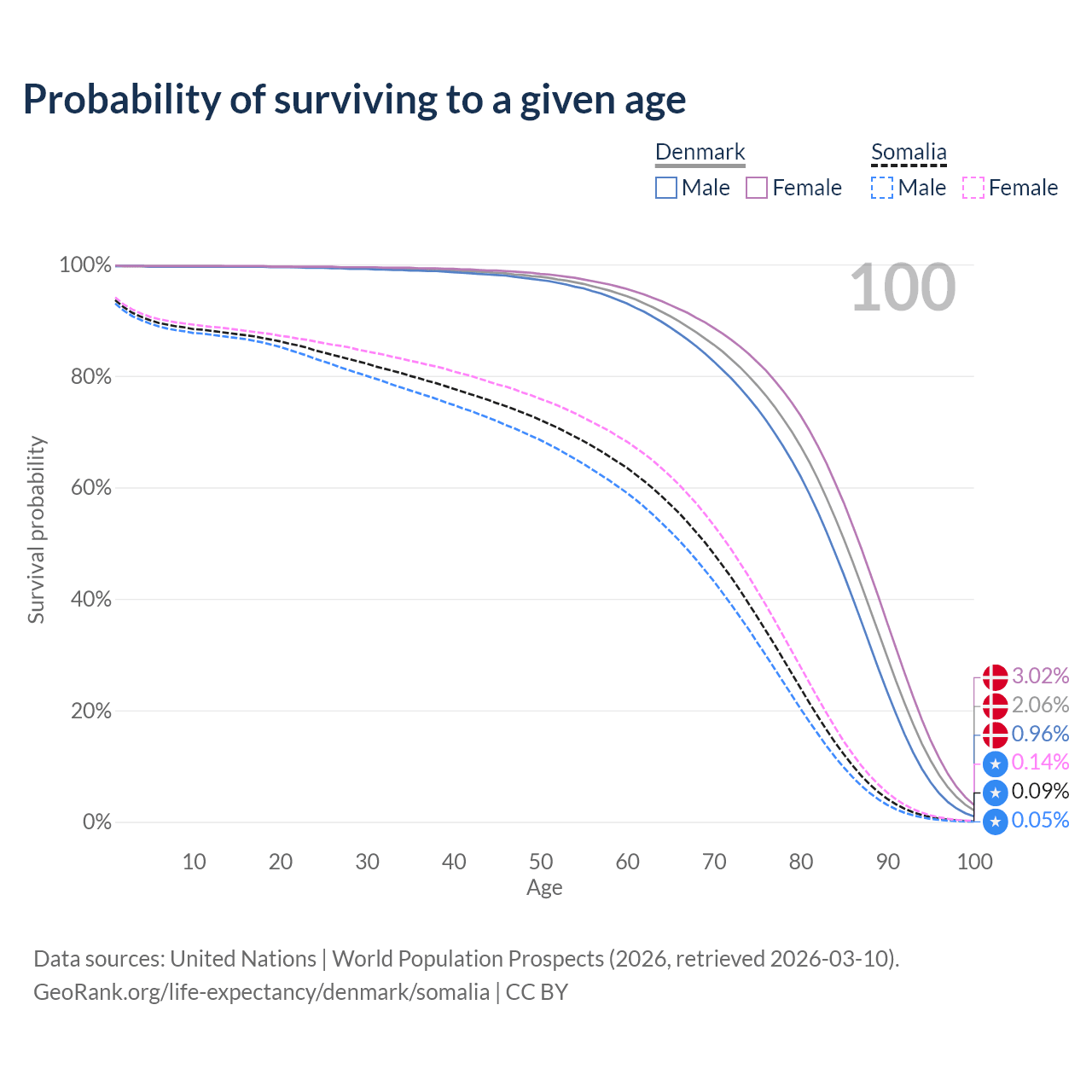 This life expectancy calculator shows the odds of living to 100, 95, 90, and below based on current age for both males and females in Denmark and Somalia, along with mean and median age of death. The calculations are based on the 2026 life tables (actuarial tables) from the UN World Population Prospects.