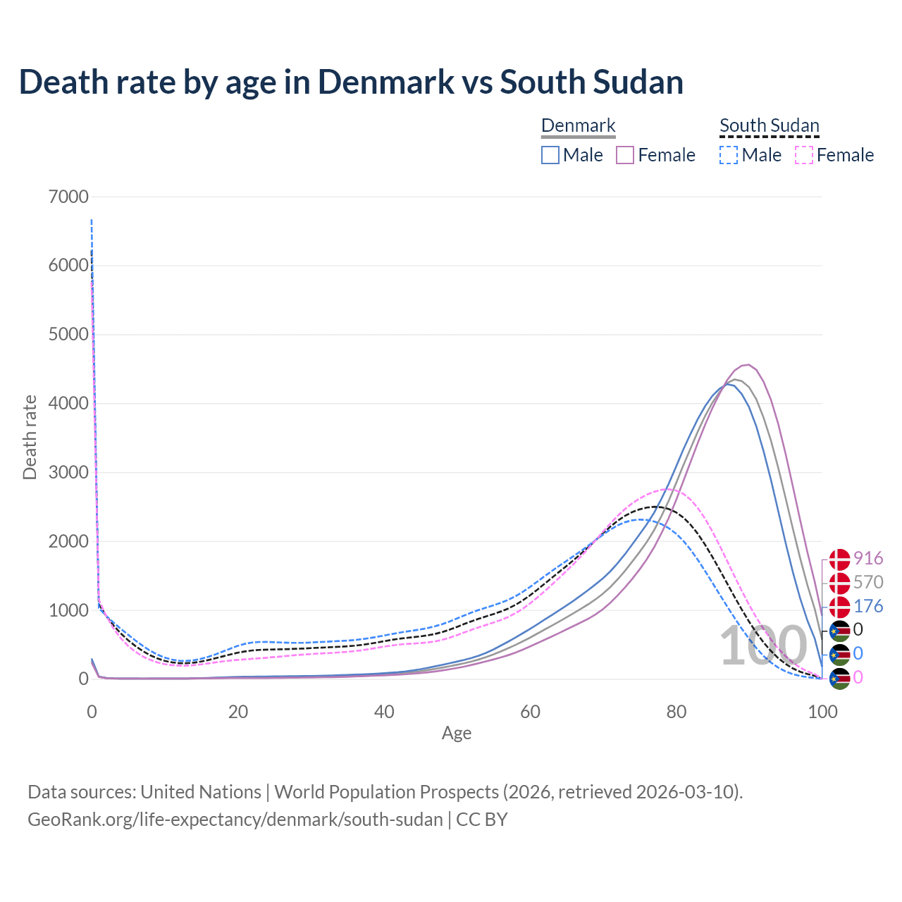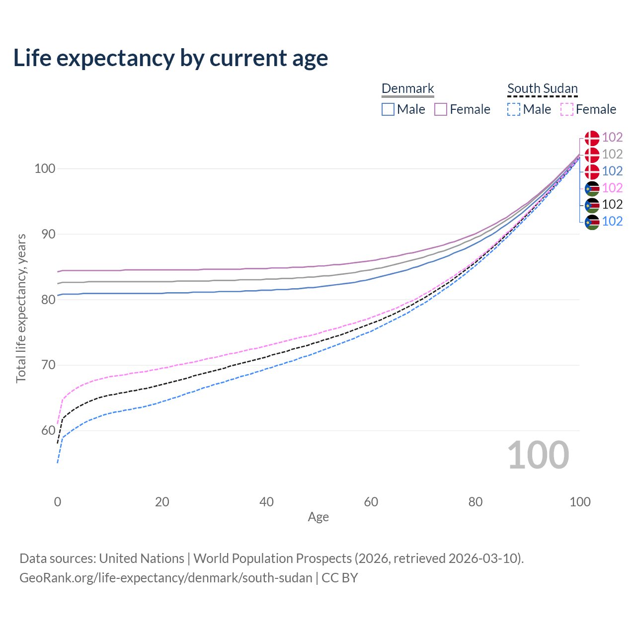 This life expectancy calculator shows the odds of living to 100, 95, 90, and below based on current age for both males and females in Denmark and South Sudan, along with mean and median age of death. The calculations are based on the 2026 life tables (actuarial tables) from the UN World Population Prospects.