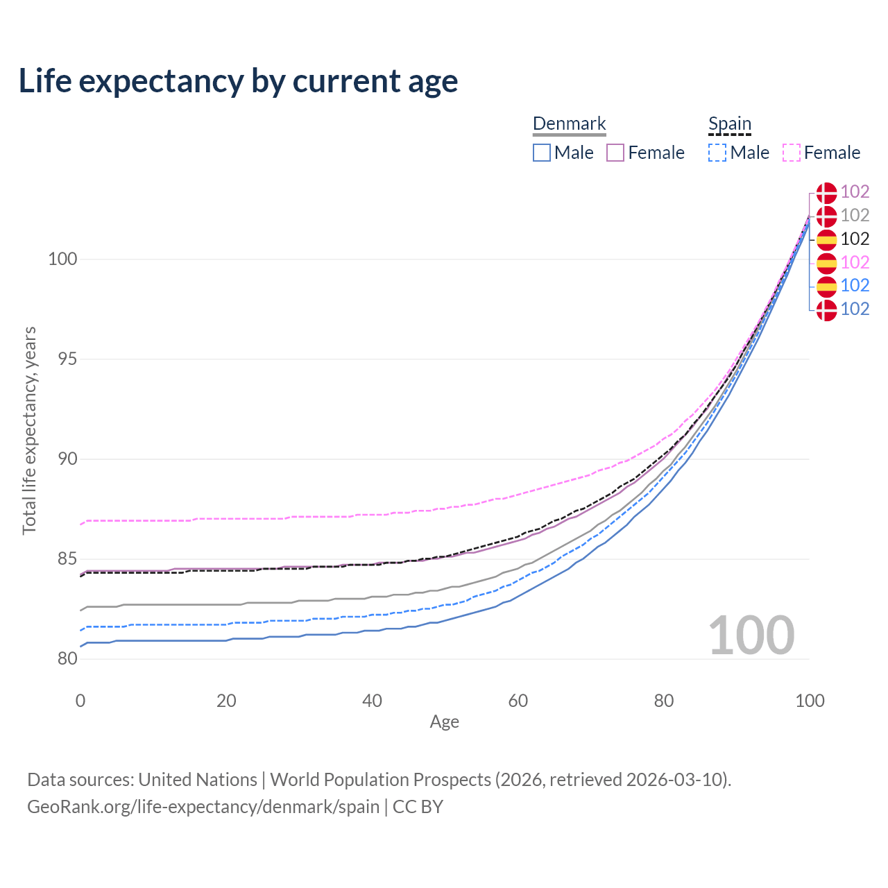 This life expectancy calculator shows the odds of living to 100, 95, 90, and below based on current age for both males and females in Denmark and Spain, along with mean and median age of death. The calculations are based on the 2026 life tables (actuarial tables) from the UN World Population Prospects.