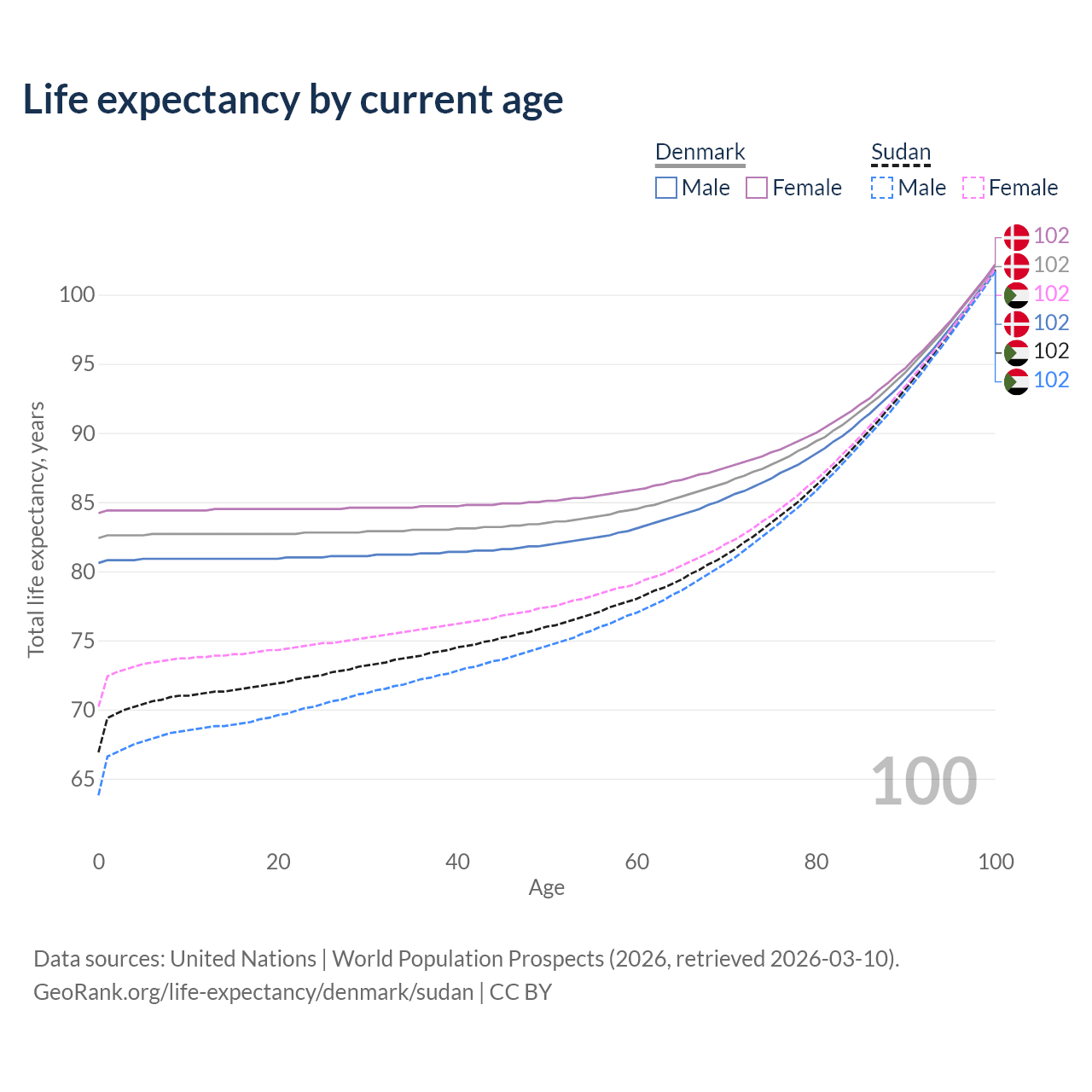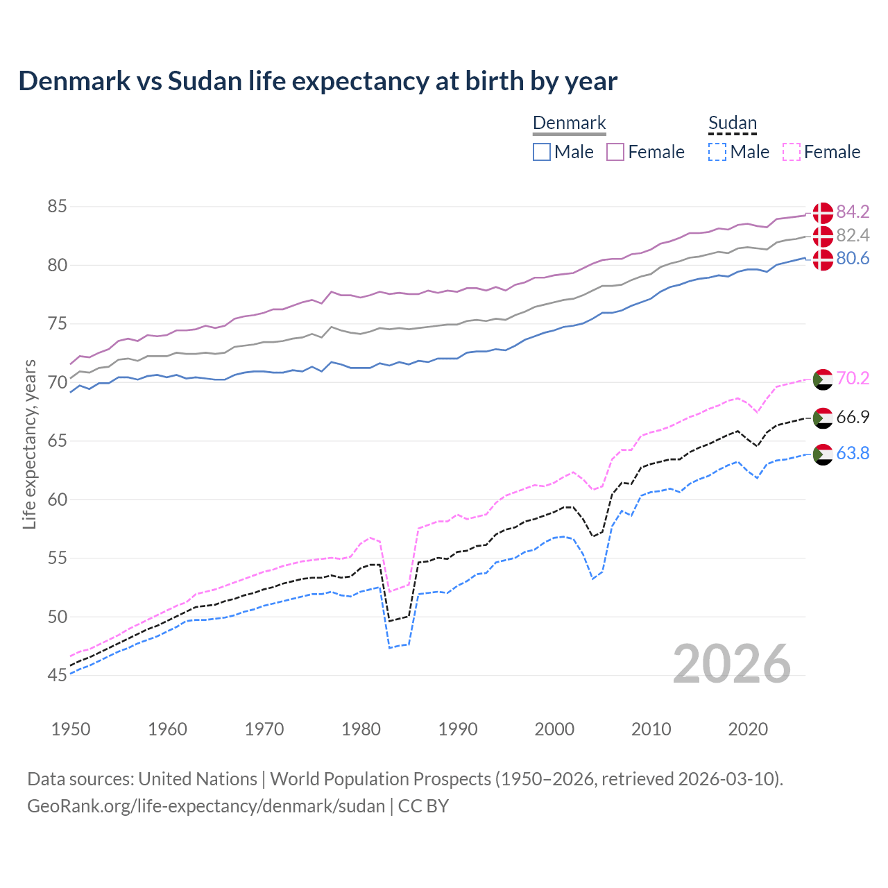 The average life expectancy at birth is 82.4 years in Denmark vs 66.9 in Sudan. Denmark is ranked 31/197 by life expectancy, and Sudan is 160/197. In Denmark, the life expectancy is 80.6 years for males and 84.2 years for females. In Sudan, it's 63.8 years for males and 70.2 years for females.