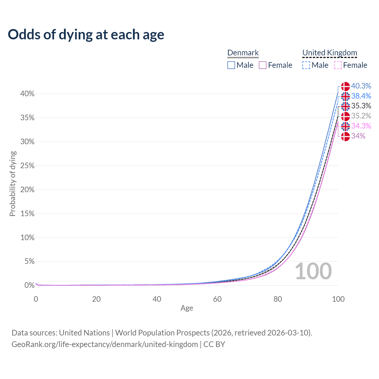 This life expectancy calculator shows the odds of living to 100, 95, 90, and below based on current age for both males and females in Denmark and the United Kingdom, along with mean and median age of death. The calculations are based on the 2026 life tables (actuarial tables) from the UN World Population Prospects.