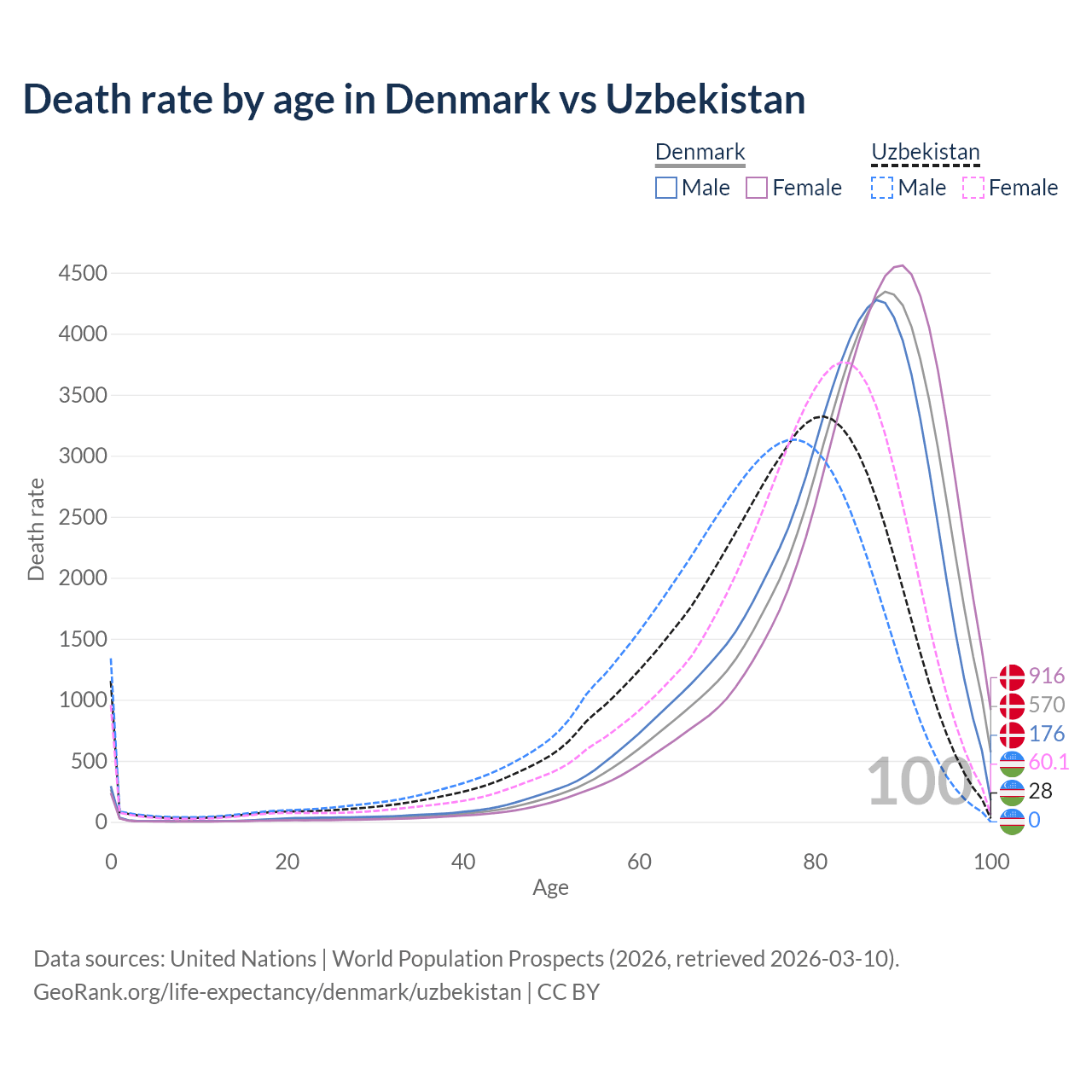 In Denmark, the most common age of death is 88, compared to 81 in Uzbekistan. The median age of death is 85.2 in Denmark and 76.4 in Uzbekistan, meaning only half of each cohort is expected to live past that age.