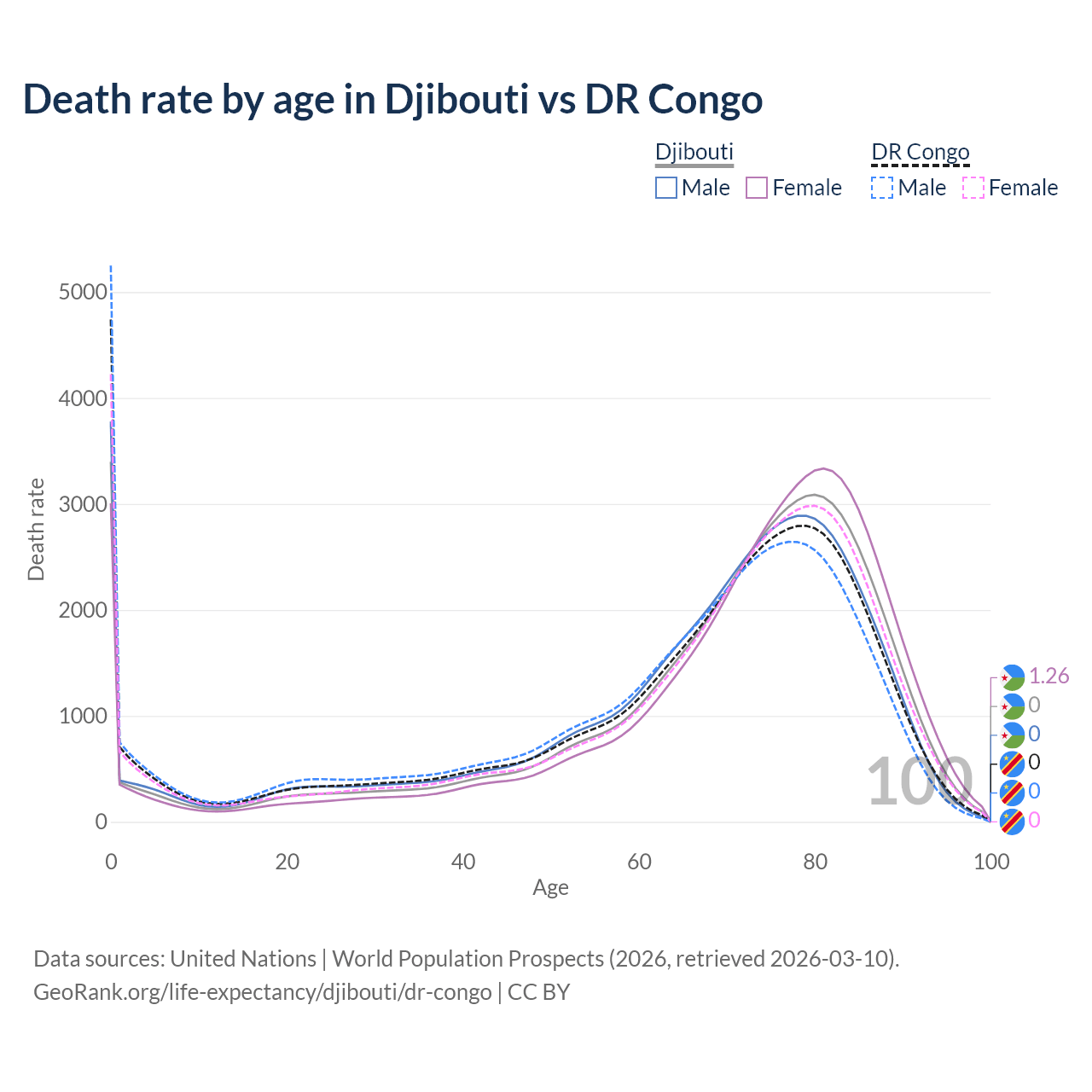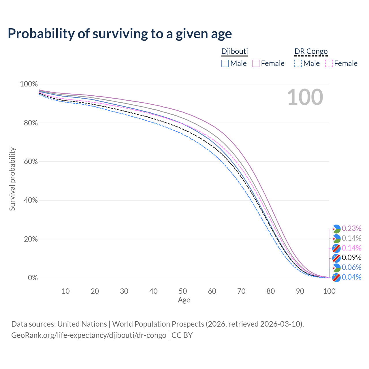 This life expectancy calculator shows the odds of living to 100, 95, 90, and below based on current age for both males and females in Djibouti and the DR Congo, along with mean and median age of death. The calculations are based on the 2026 life tables (actuarial tables) from the UN World Population Prospects.