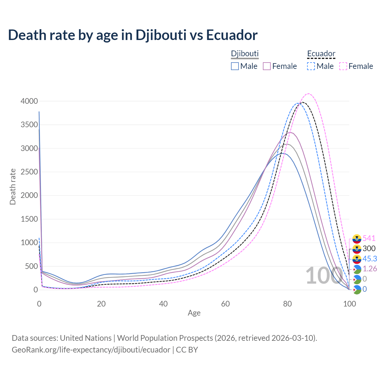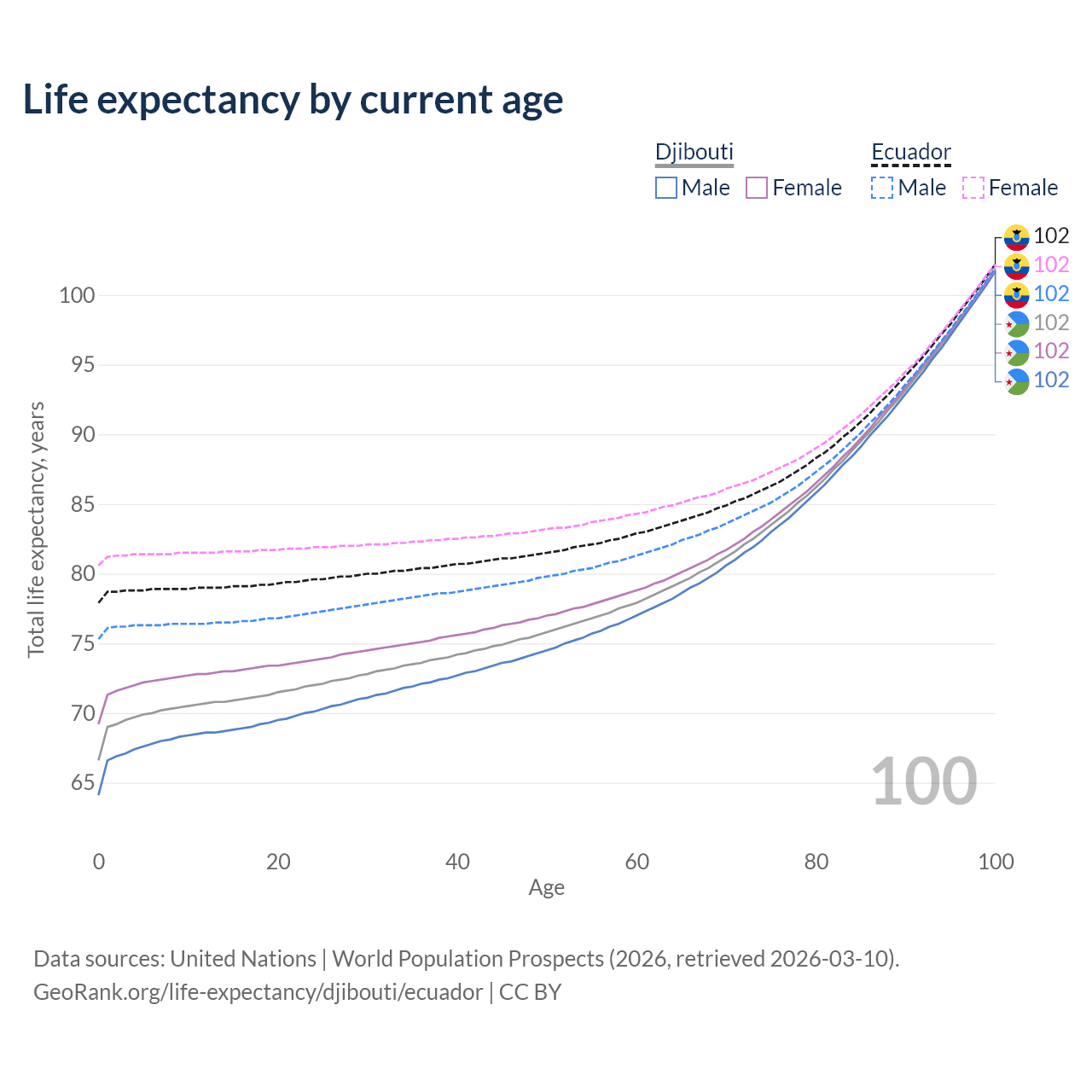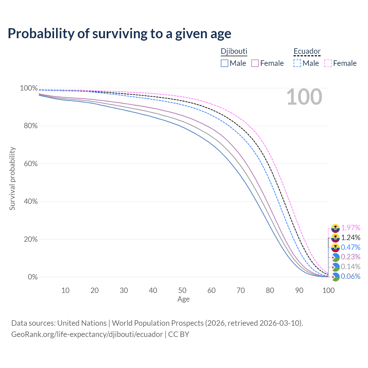 This life expectancy calculator shows the odds of living to 100, 95, 90, and below based on current age for both males and females in Djibouti and Ecuador, along with mean and median age of death. The calculations are based on the 2026 life tables (actuarial tables) from the UN World Population Prospects.