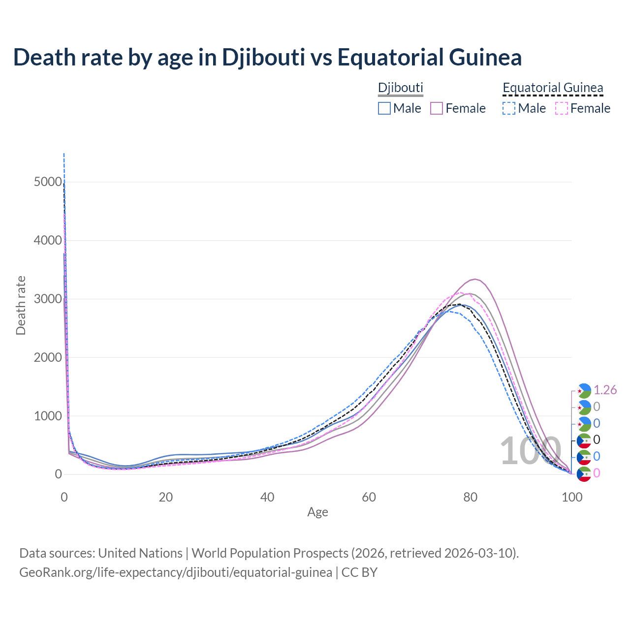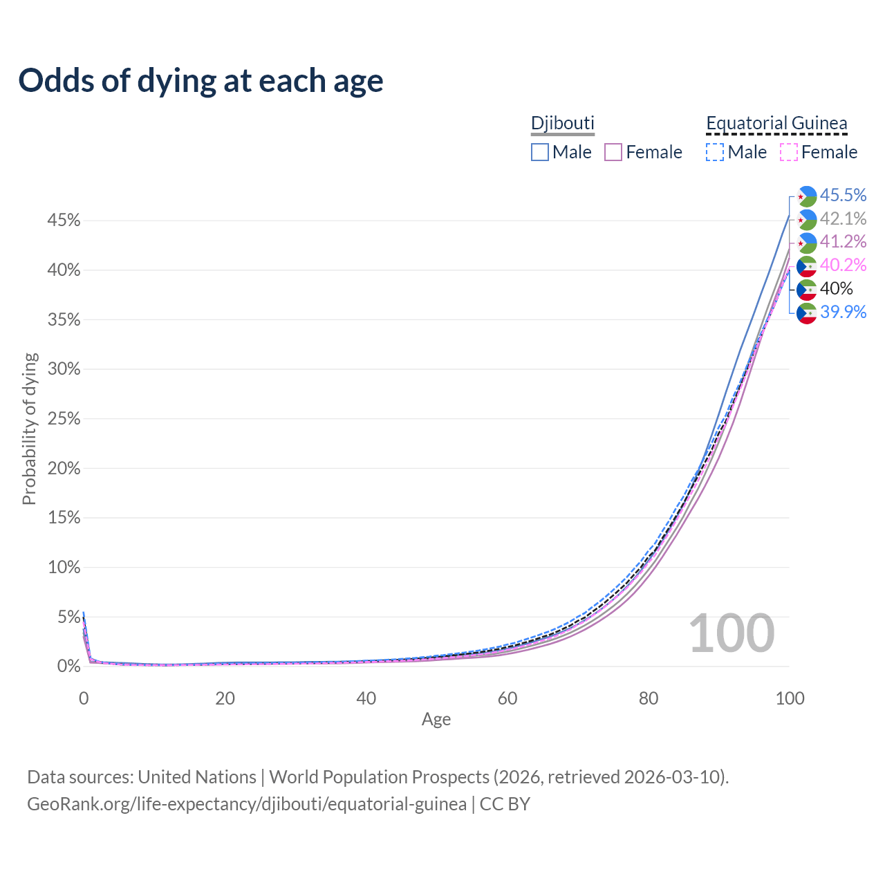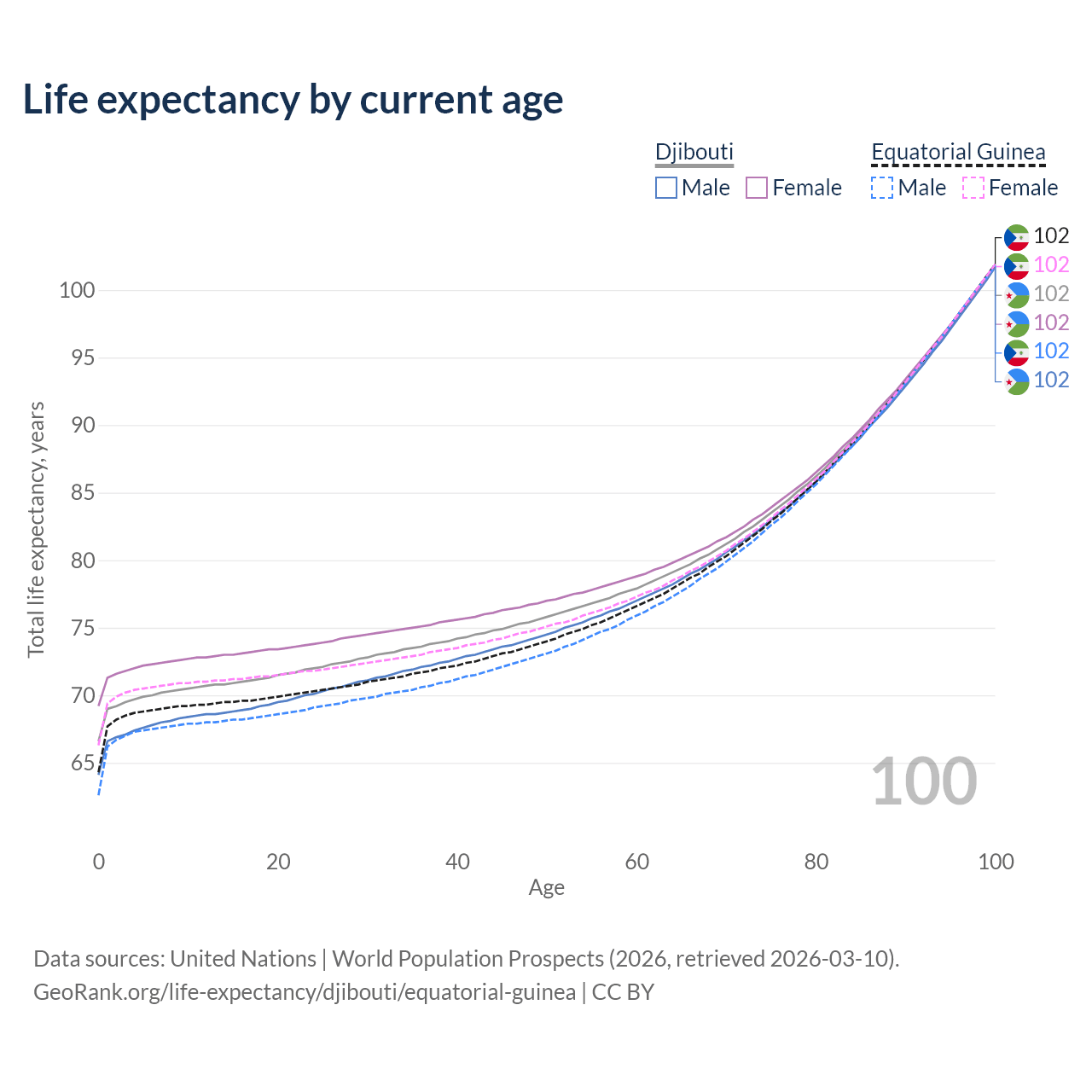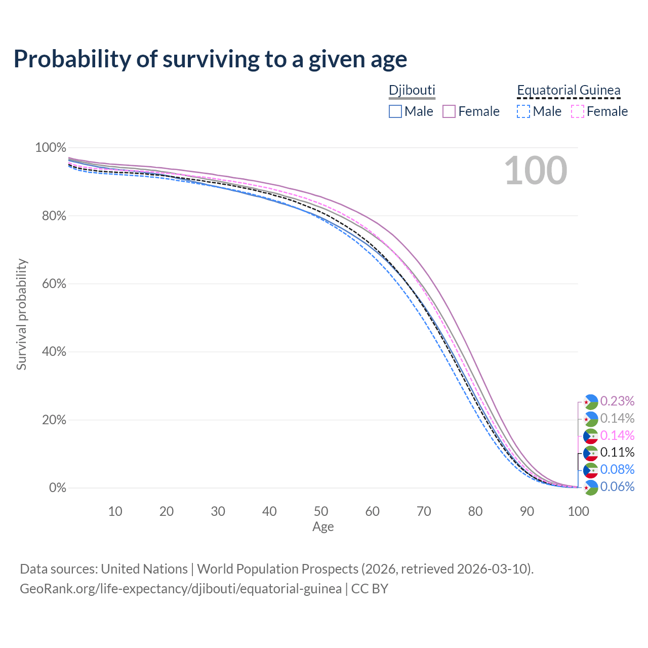This life expectancy calculator shows the odds of living to 100, 95, 90, and below based on current age for both males and females in Djibouti and Equatorial Guinea, along with mean and median age of death. The calculations are based on the 2026 life tables (actuarial tables) from the UN World Population Prospects.