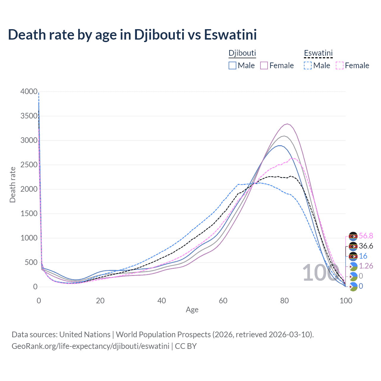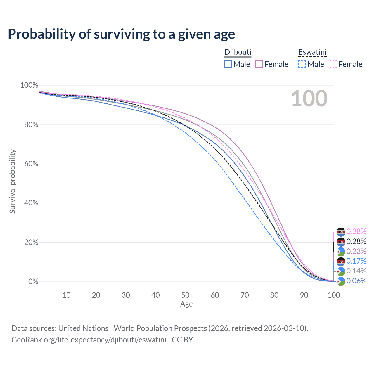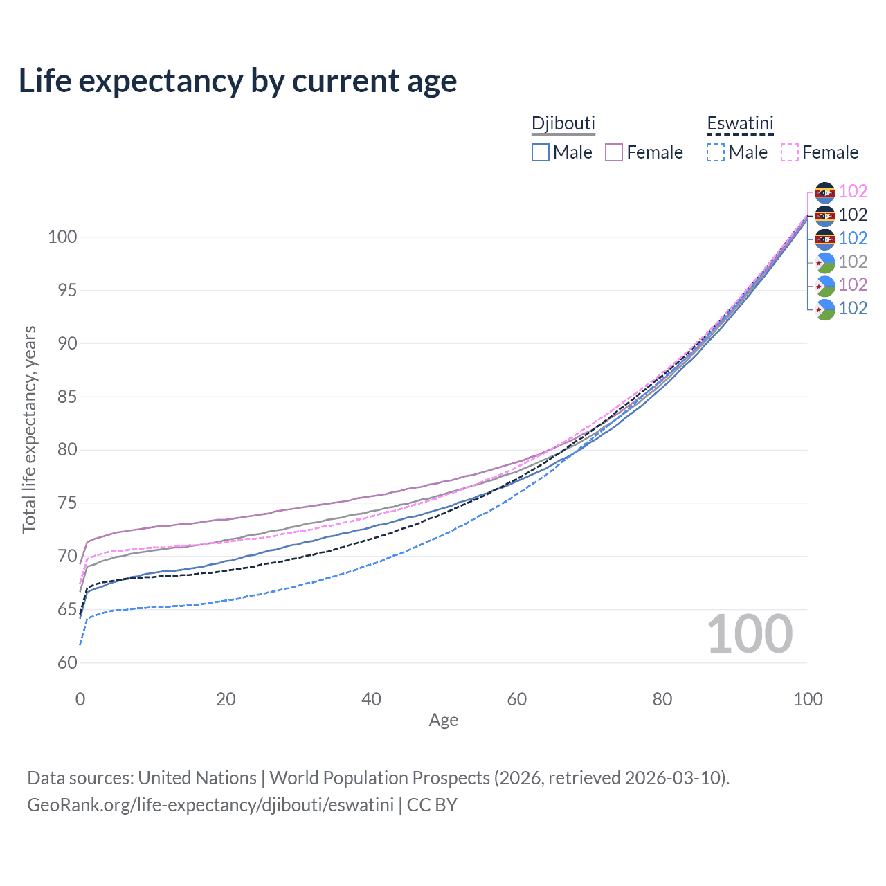 This life expectancy calculator shows the odds of living to 100, 95, 90, and below based on current age for both males and females in Djibouti and Eswatini, along with mean and median age of death. The calculations are based on the 2026 life tables (actuarial tables) from the UN World Population Prospects.