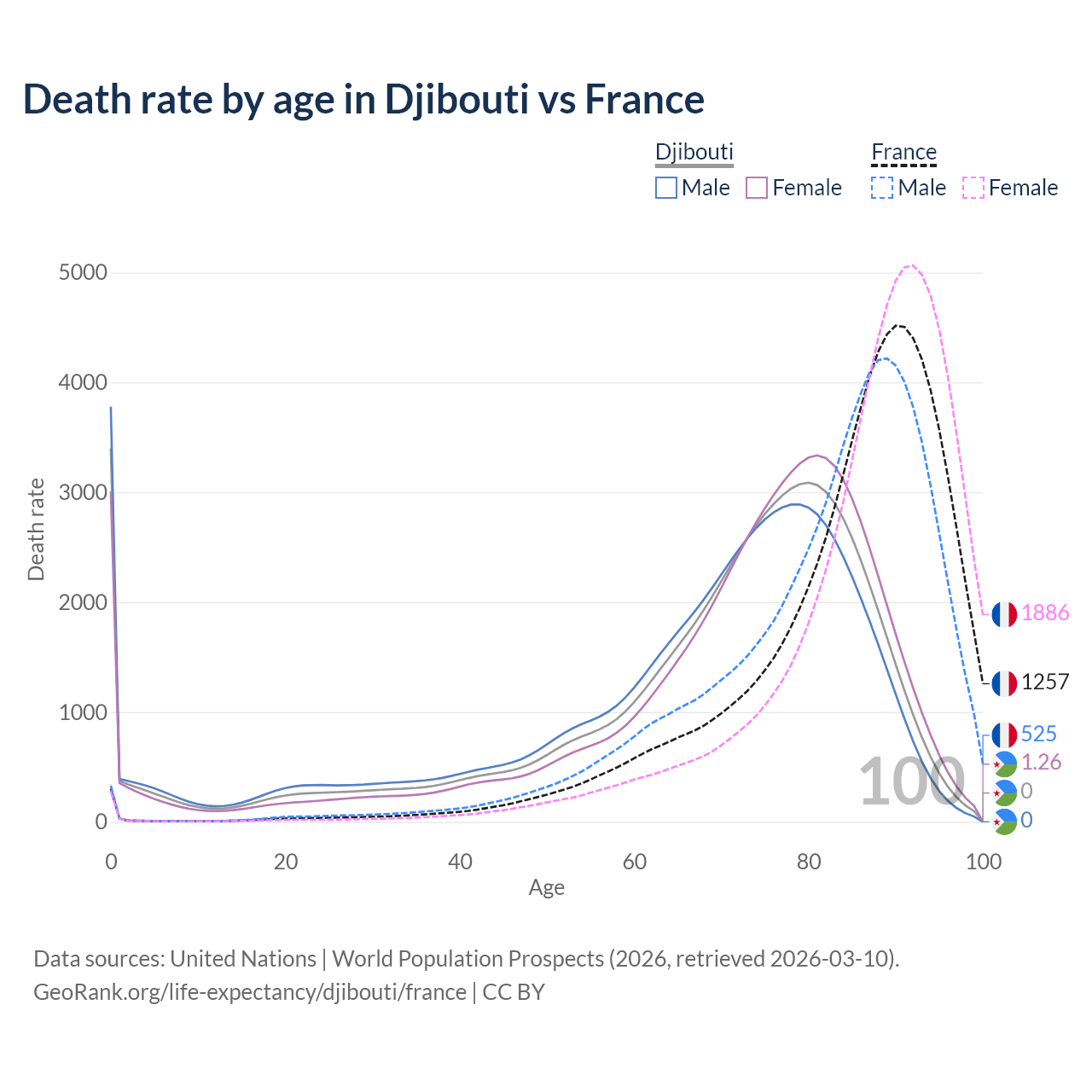 In Djibouti, the most common age of death is 0, compared to 90 in France. The median age of death is 73.7 in Djibouti and 87.4 in France, meaning only half of each cohort is expected to live past that age.