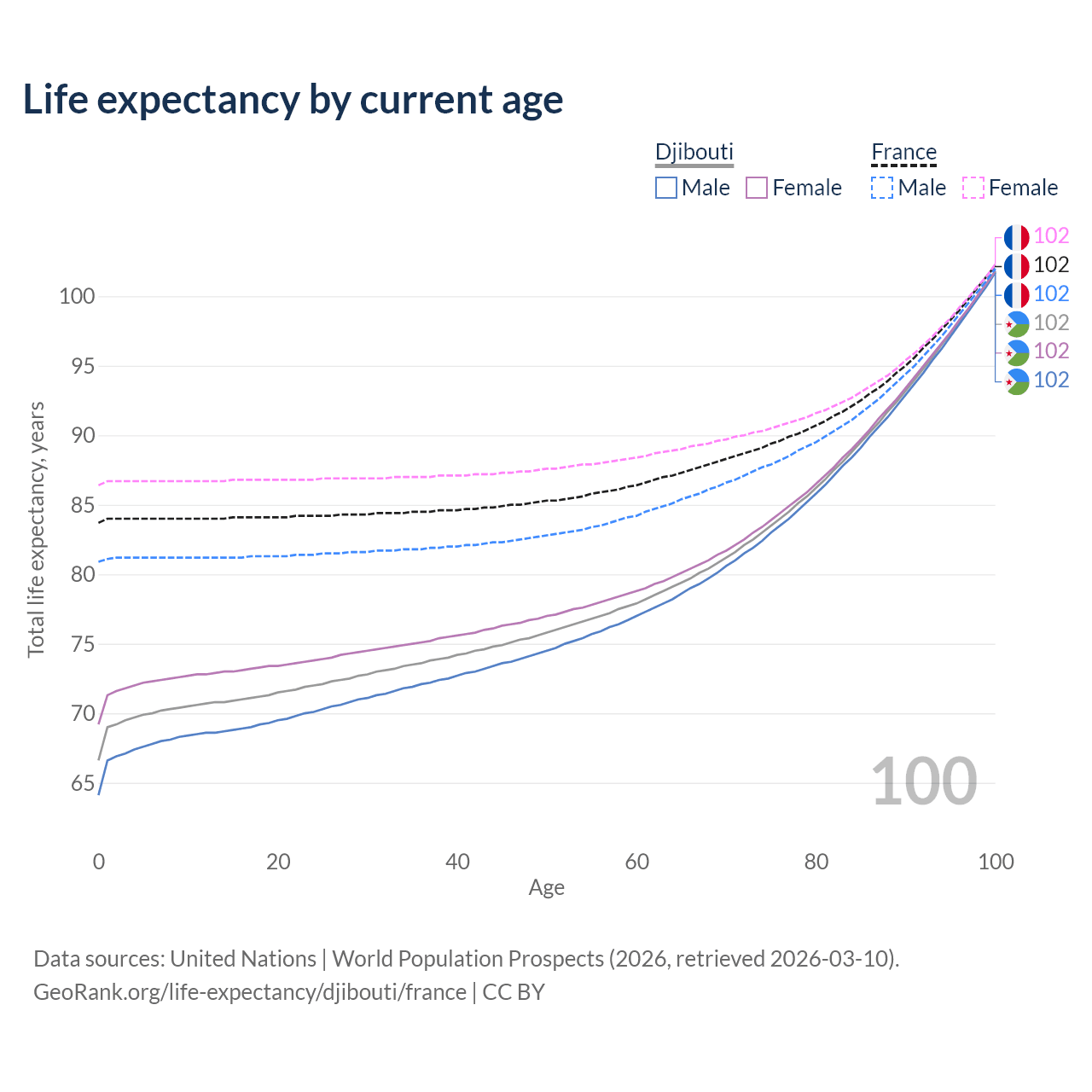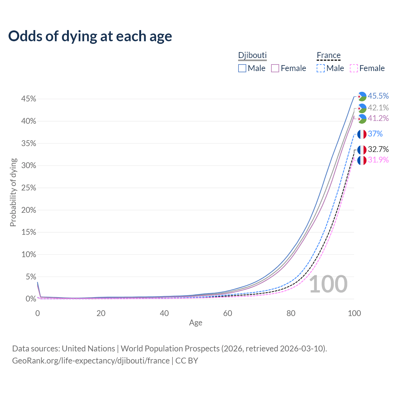 This life expectancy calculator shows the odds of living to 100, 95, 90, and below based on current age for both males and females in Djibouti and France, along with mean and median age of death. The calculations are based on the 2026 life tables (actuarial tables) from the UN World Population Prospects.