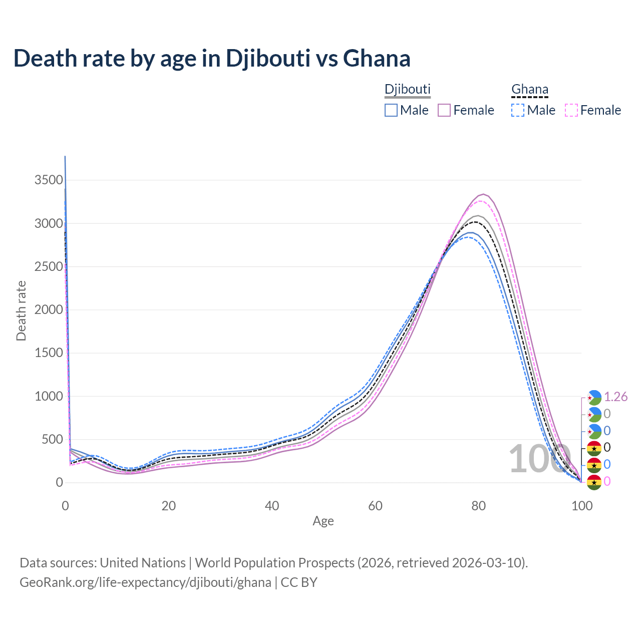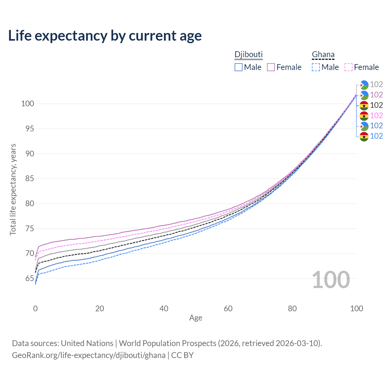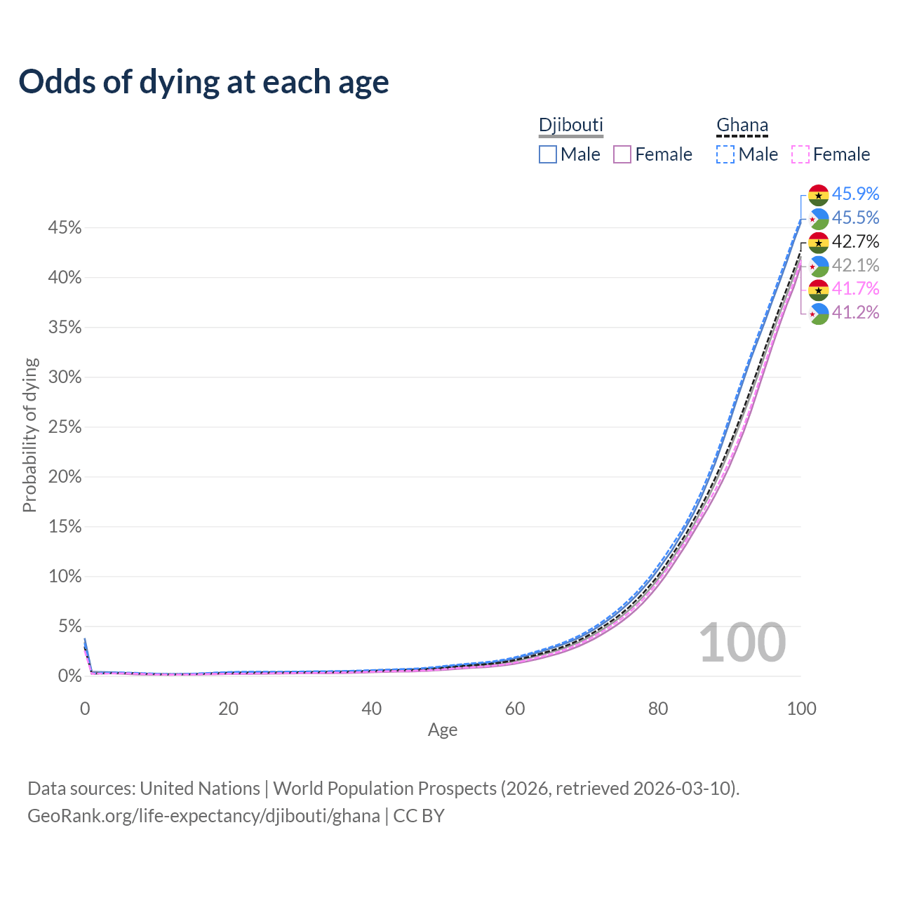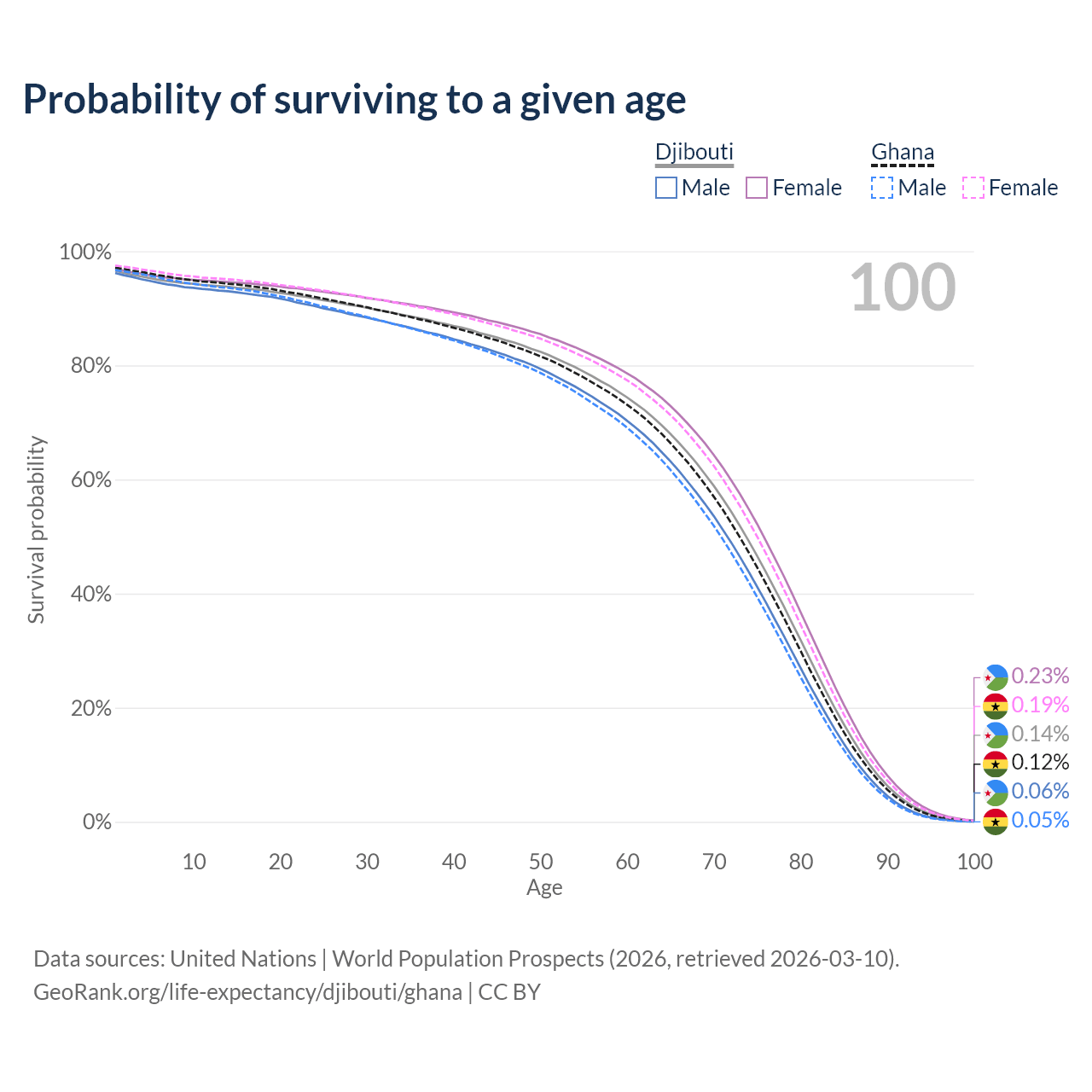 This life expectancy calculator shows the odds of living to 100, 95, 90, and below based on current age for both males and females in Djibouti and Ghana, along with mean and median age of death. The calculations are based on the 2026 life tables (actuarial tables) from the UN World Population Prospects.