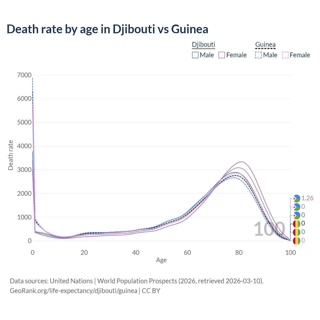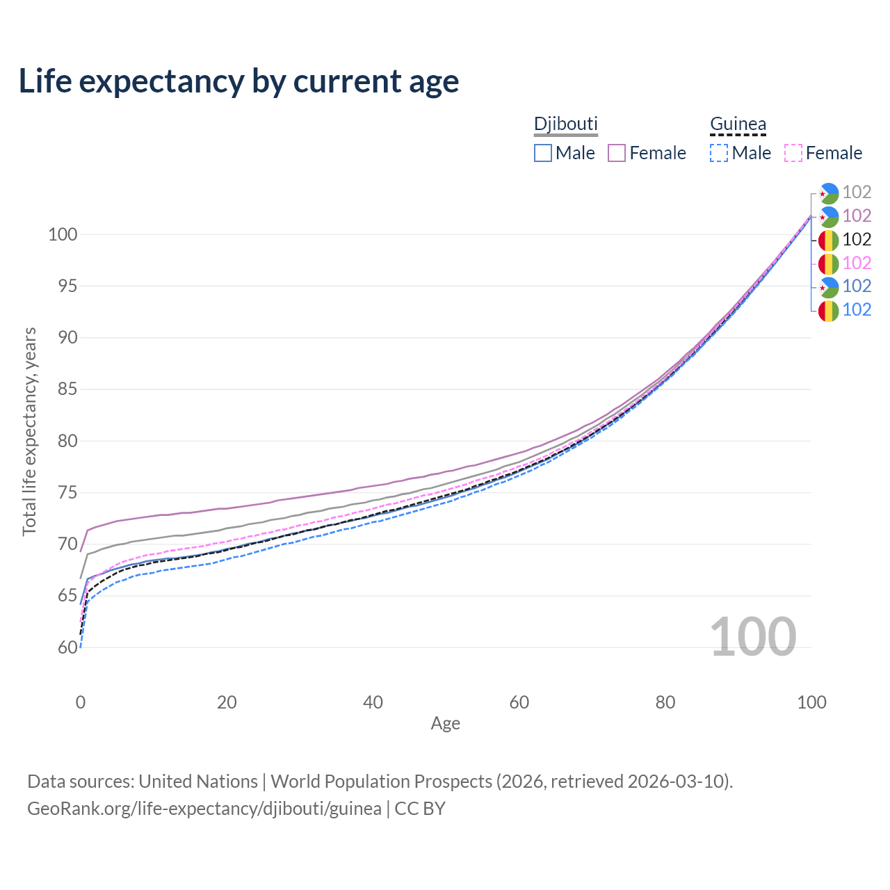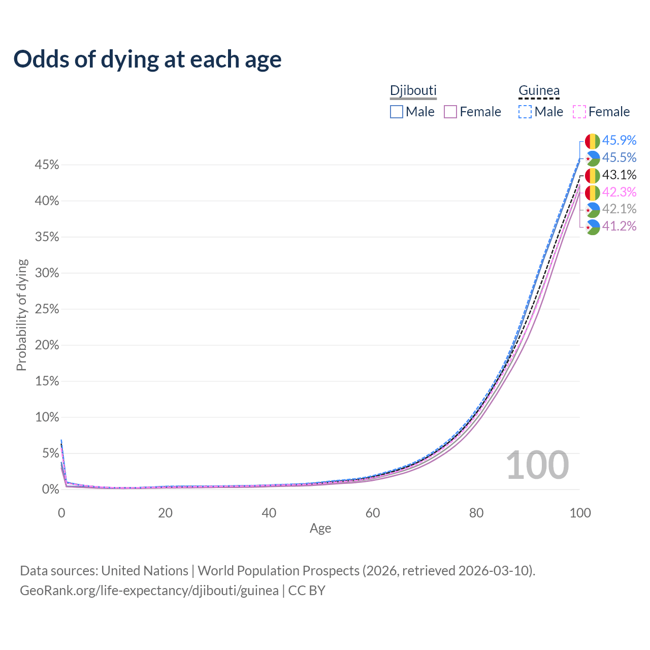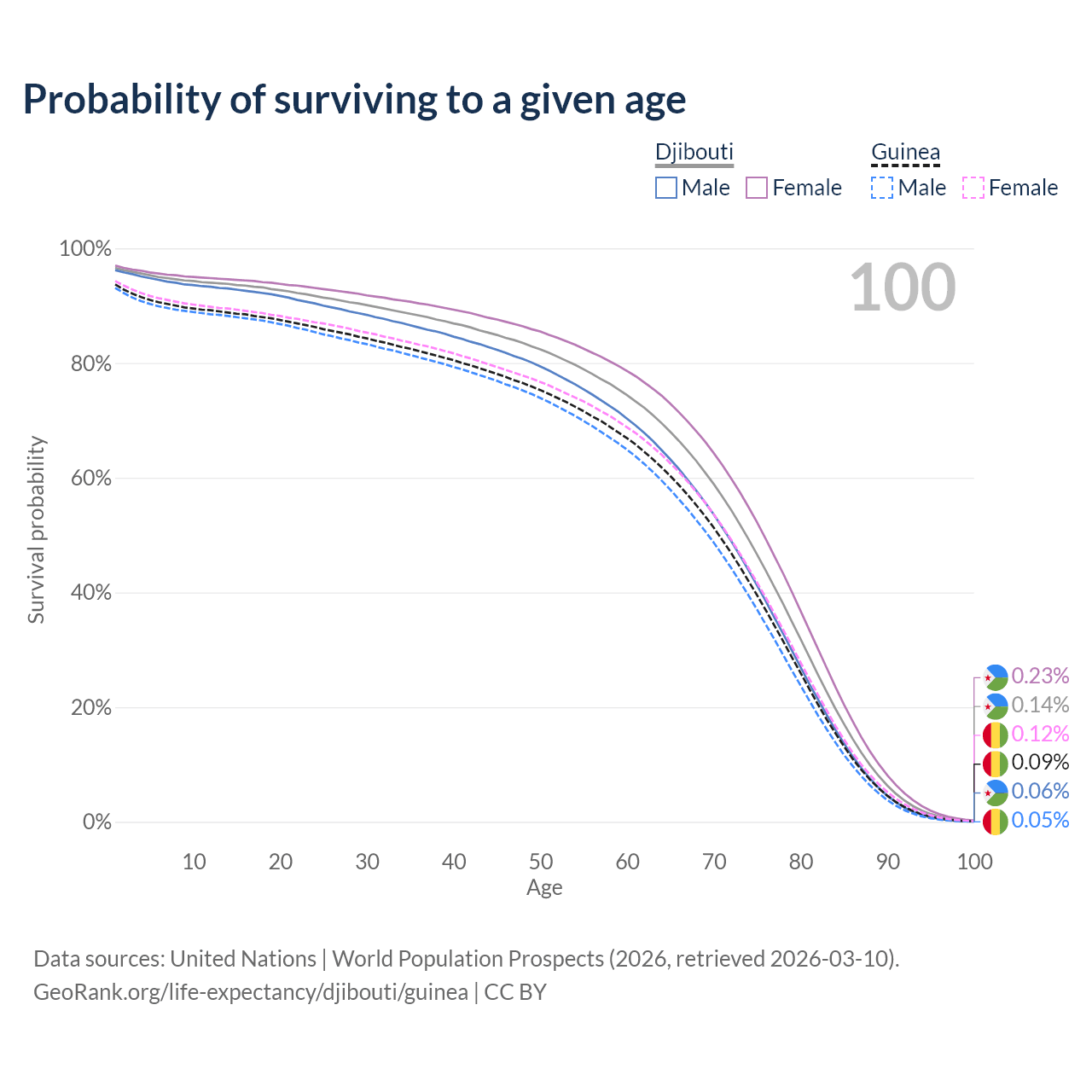 This life expectancy calculator shows the odds of living to 100, 95, 90, and below based on current age for both males and females in Djibouti and Guinea, along with mean and median age of death. The calculations are based on the 2026 life tables (actuarial tables) from the UN World Population Prospects.