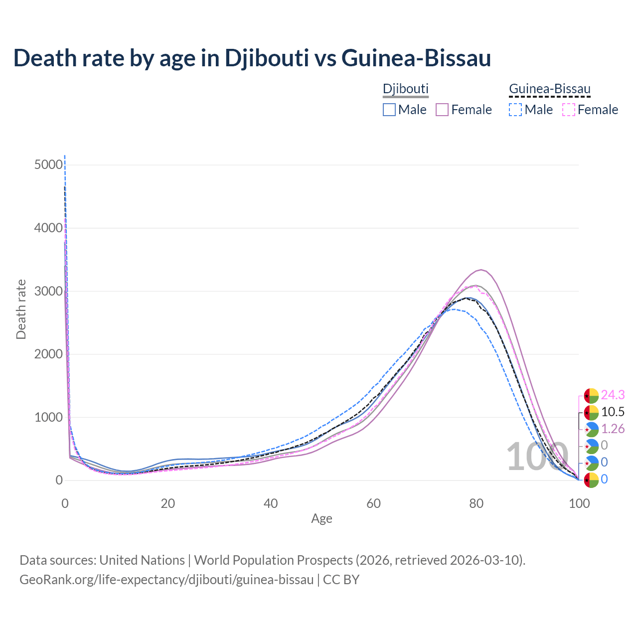 In Djibouti, the most common age of death is 0, compared to 0 in Guinea-Bissau. The median age of death is 73.7 in Djibouti and 71.8 in Guinea-Bissau, meaning only half of each cohort is expected to live past that age.