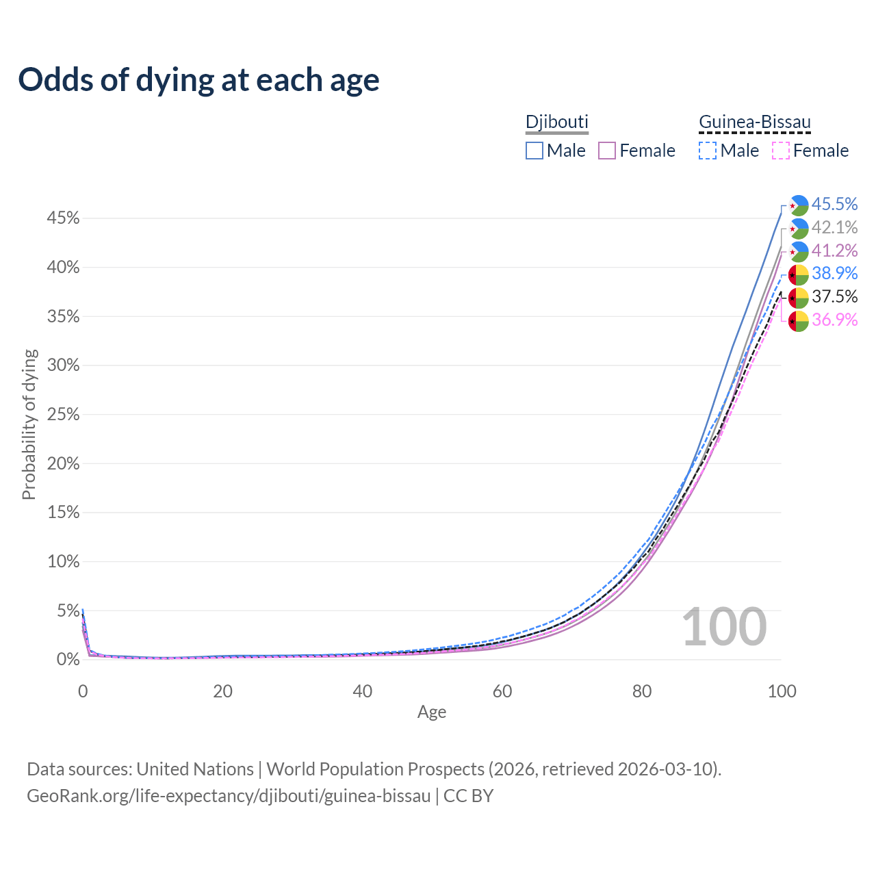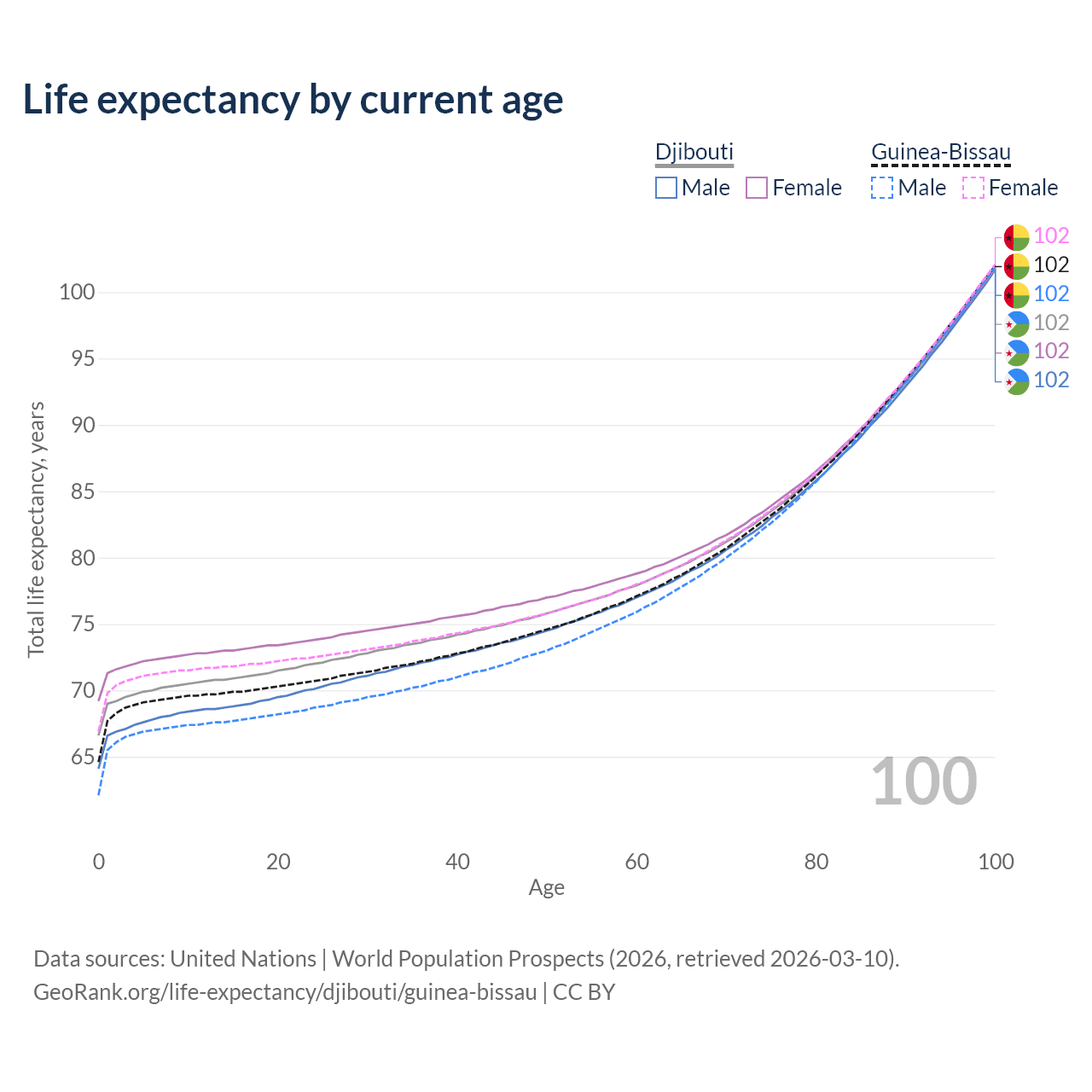 This life expectancy calculator shows the odds of living to 100, 95, 90, and below based on current age for both males and females in Djibouti and Guinea-Bissau, along with mean and median age of death. The calculations are based on the 2026 life tables (actuarial tables) from the UN World Population Prospects.