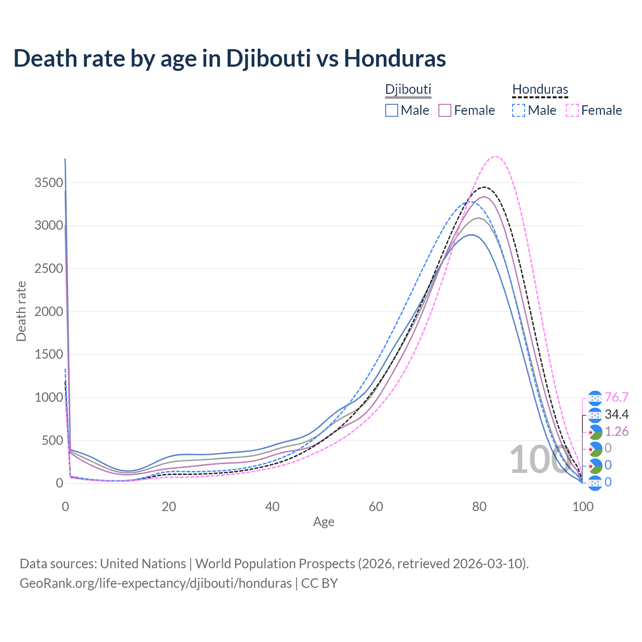 In Djibouti, the most common age of death is 0, compared to 81 in Honduras. The median age of death is 73.7 in Djibouti and 77.1 in Honduras, meaning only half of each cohort is expected to live past that age.