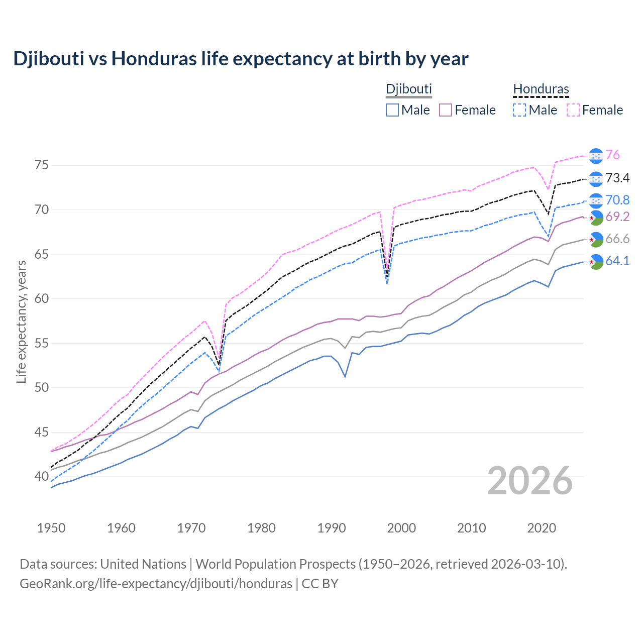 The average life expectancy at birth is 66.6 years in Djibouti vs 73.4 in Honduras. Djibouti is ranked 165/197 by life expectancy, and Honduras is 110/197. In Djibouti, the life expectancy is 64.1 years for males and 69.2 years for females. In Honduras, it's 70.8 years for males and 76 years for females.