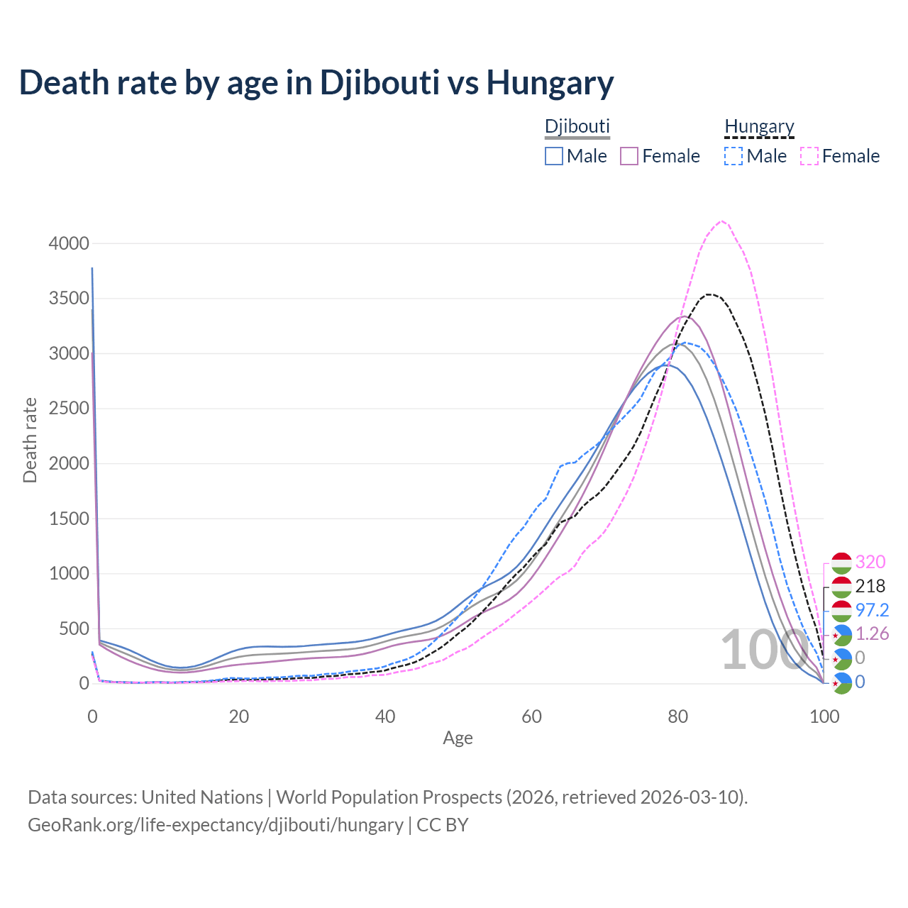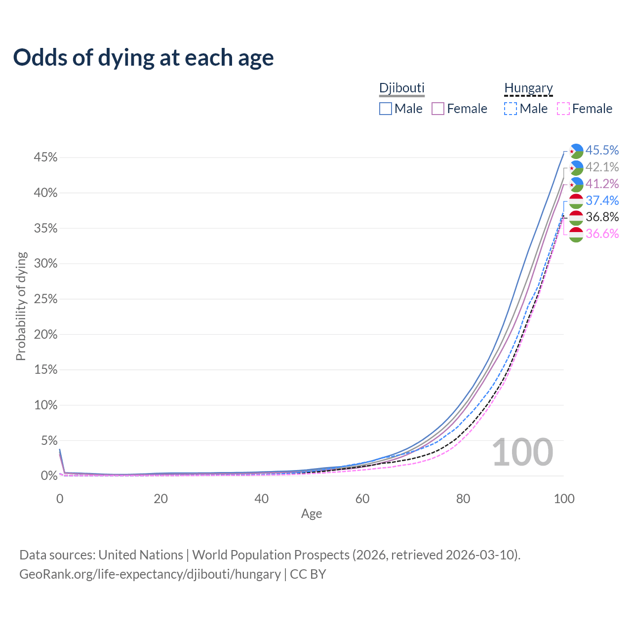 This life expectancy calculator shows the odds of living to 100, 95, 90, and below based on current age for both males and females in Djibouti and Hungary, along with mean and median age of death. The calculations are based on the 2026 life tables (actuarial tables) from the UN World Population Prospects.