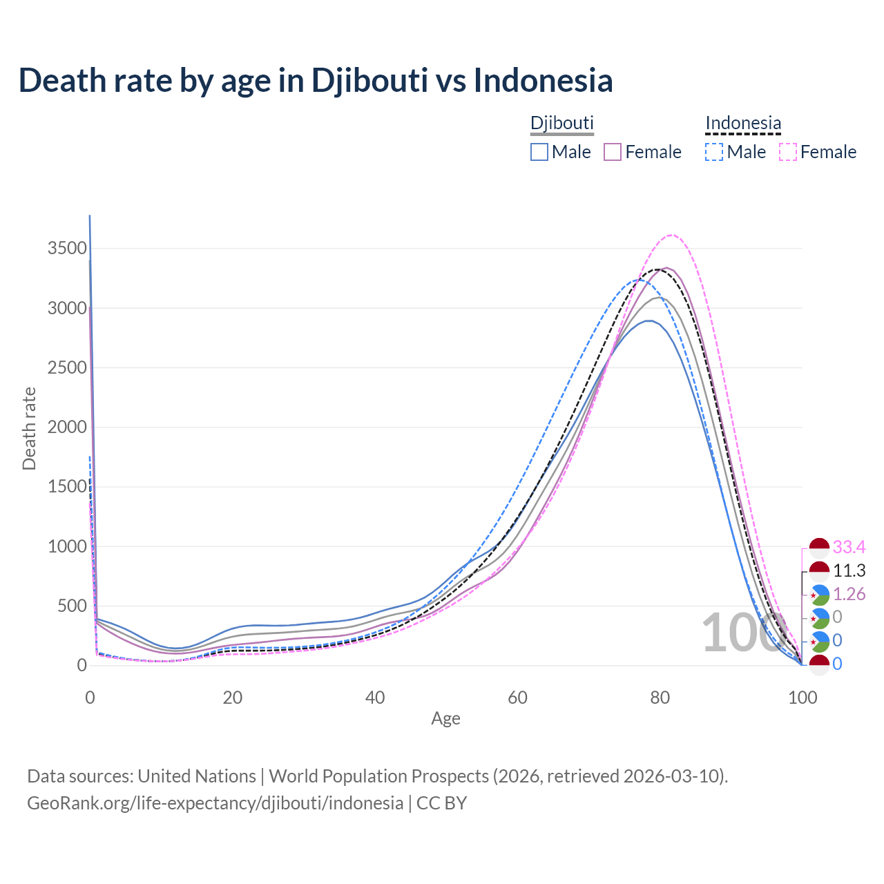 In Djibouti, the most common age of death is 0, compared to 80 in Indonesia. The median age of death is 73.7 in Djibouti and 75.6 in Indonesia, meaning only half of each cohort is expected to live past that age.