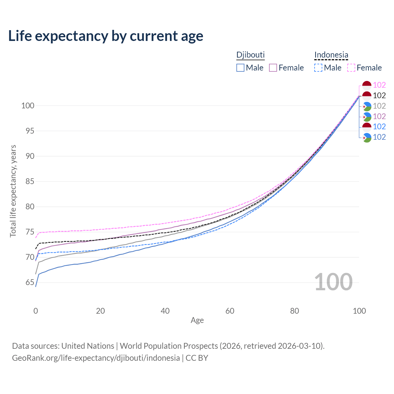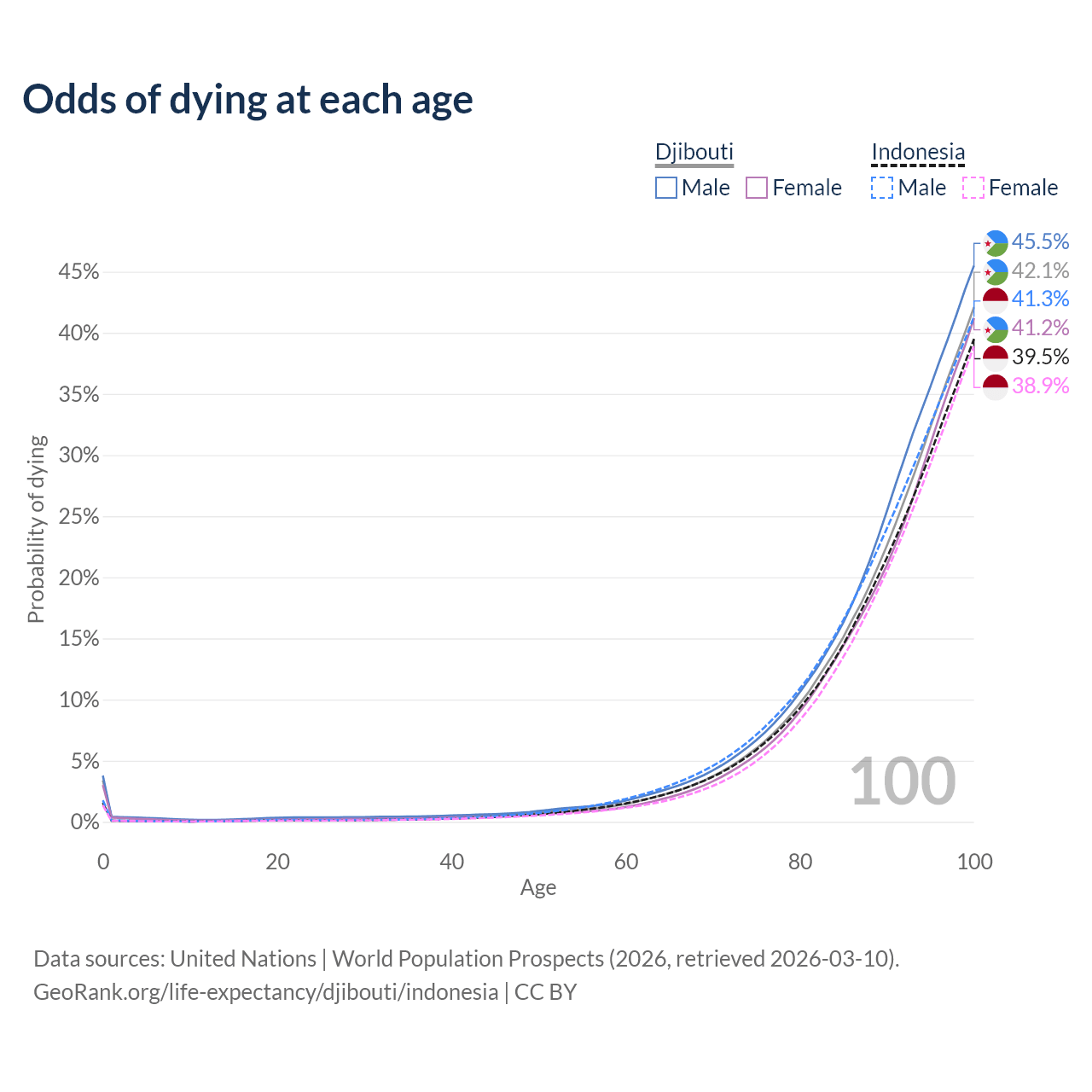 This life expectancy calculator shows the odds of living to 100, 95, 90, and below based on current age for both males and females in Djibouti and Indonesia, along with mean and median age of death. The calculations are based on the 2026 life tables (actuarial tables) from the UN World Population Prospects.