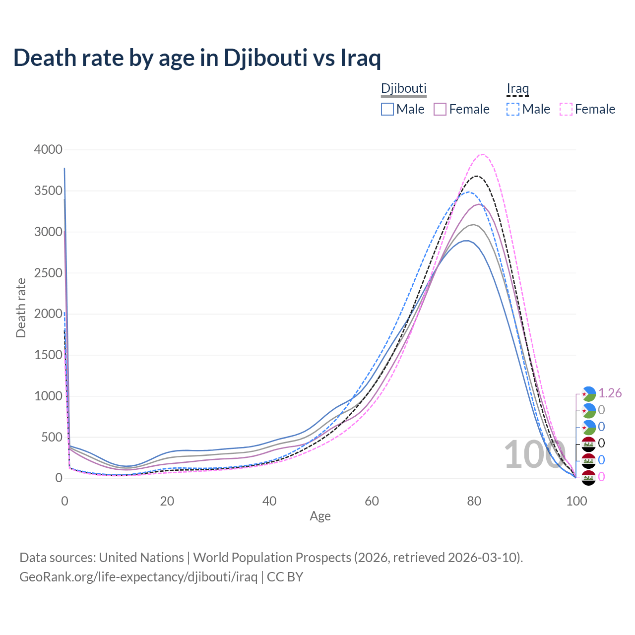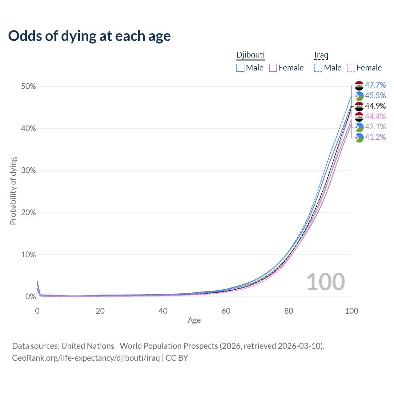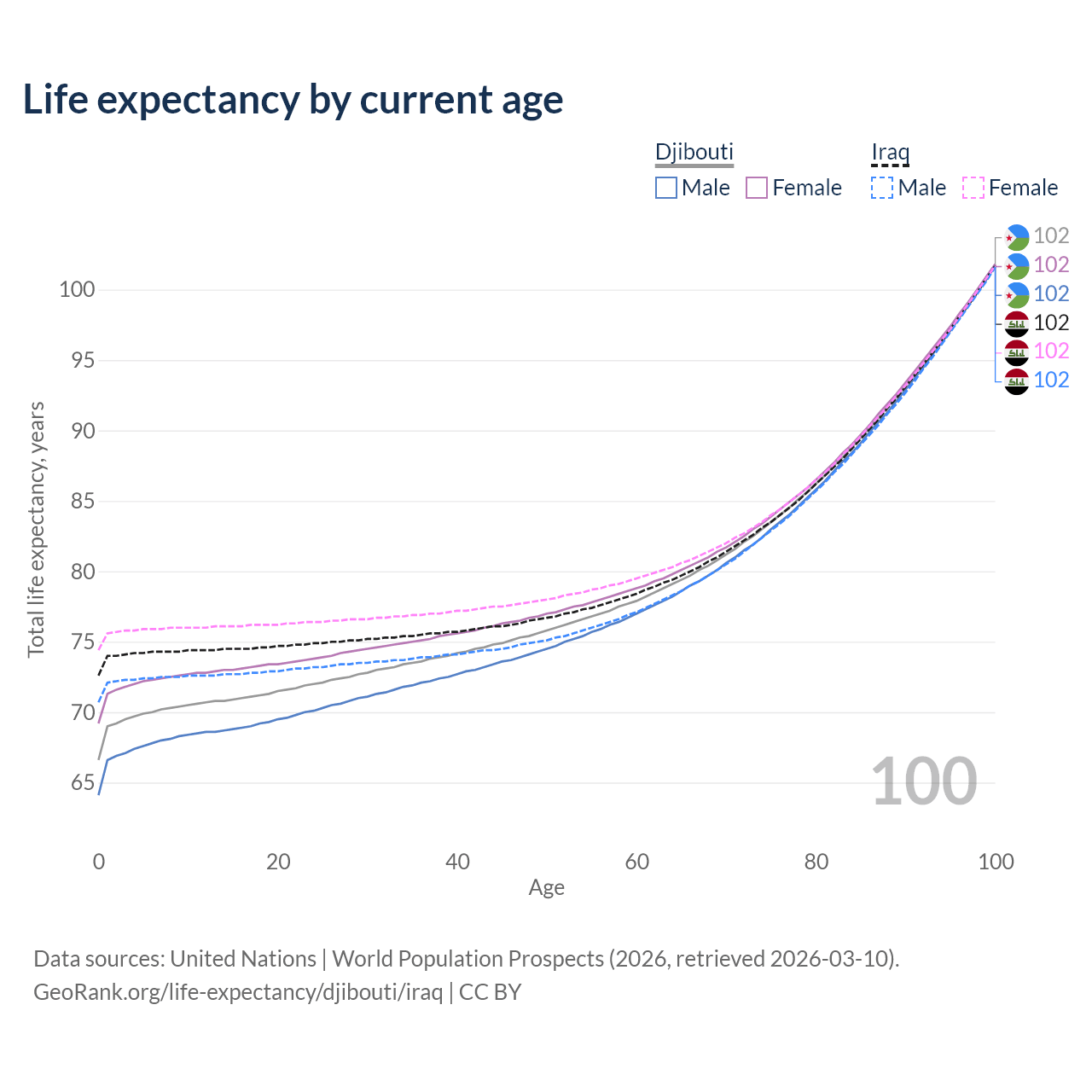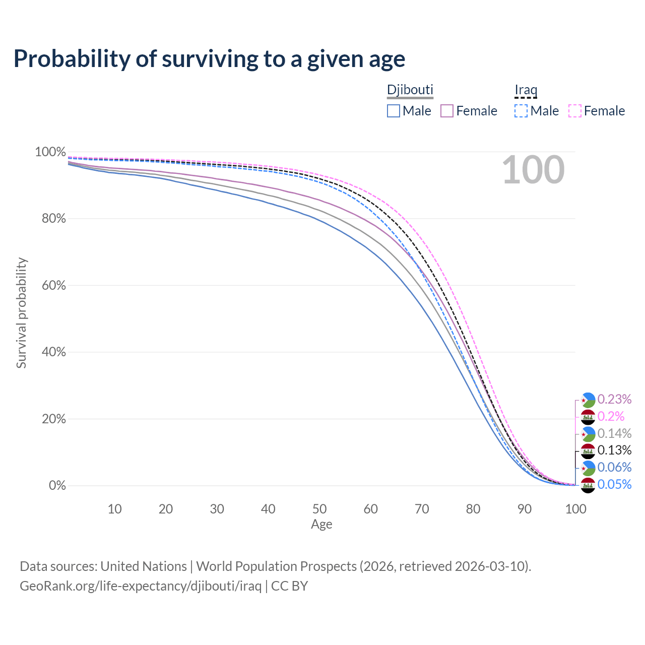 This life expectancy calculator shows the odds of living to 100, 95, 90, and below based on current age for both males and females in Djibouti and Iraq, along with mean and median age of death. The calculations are based on the 2026 life tables (actuarial tables) from the UN World Population Prospects.