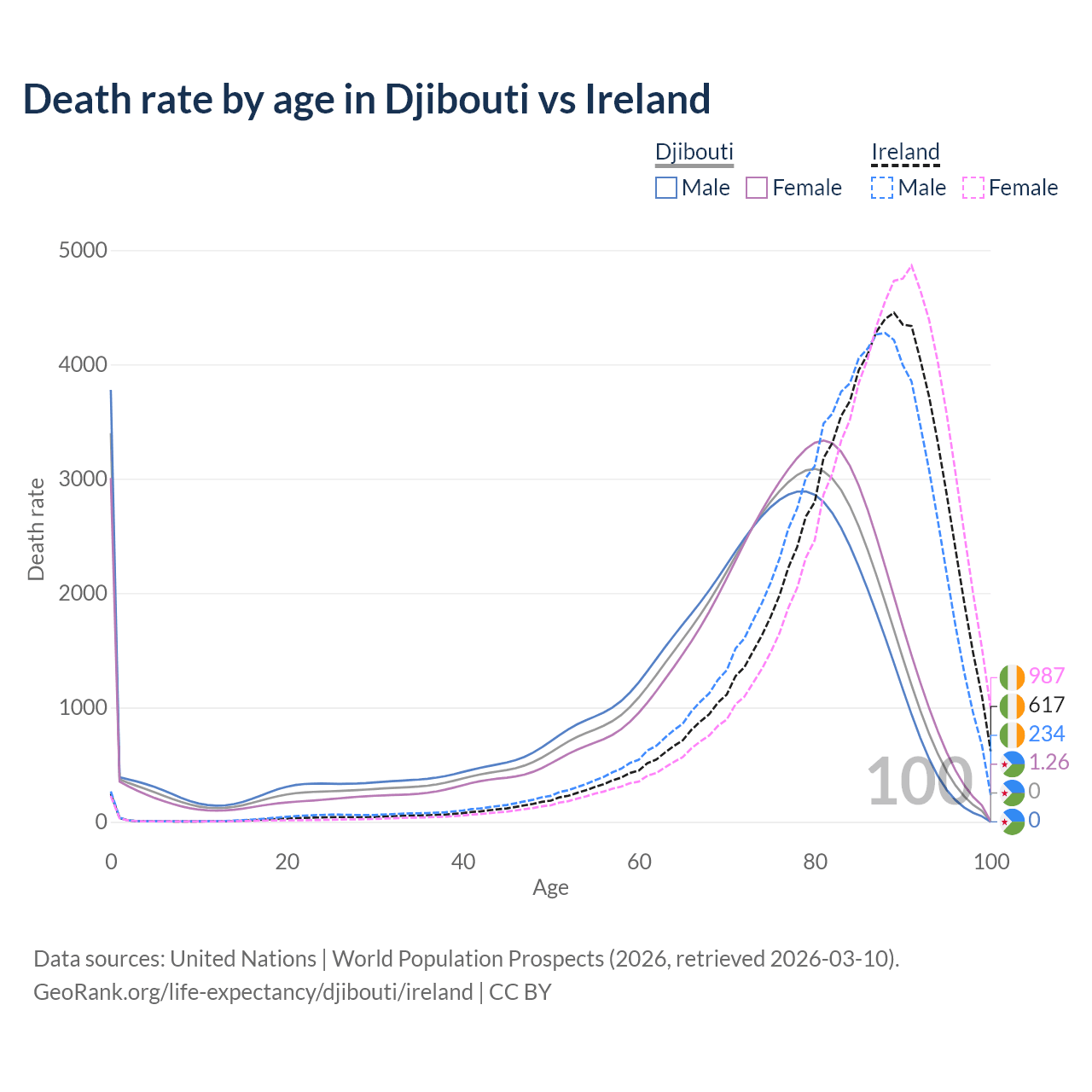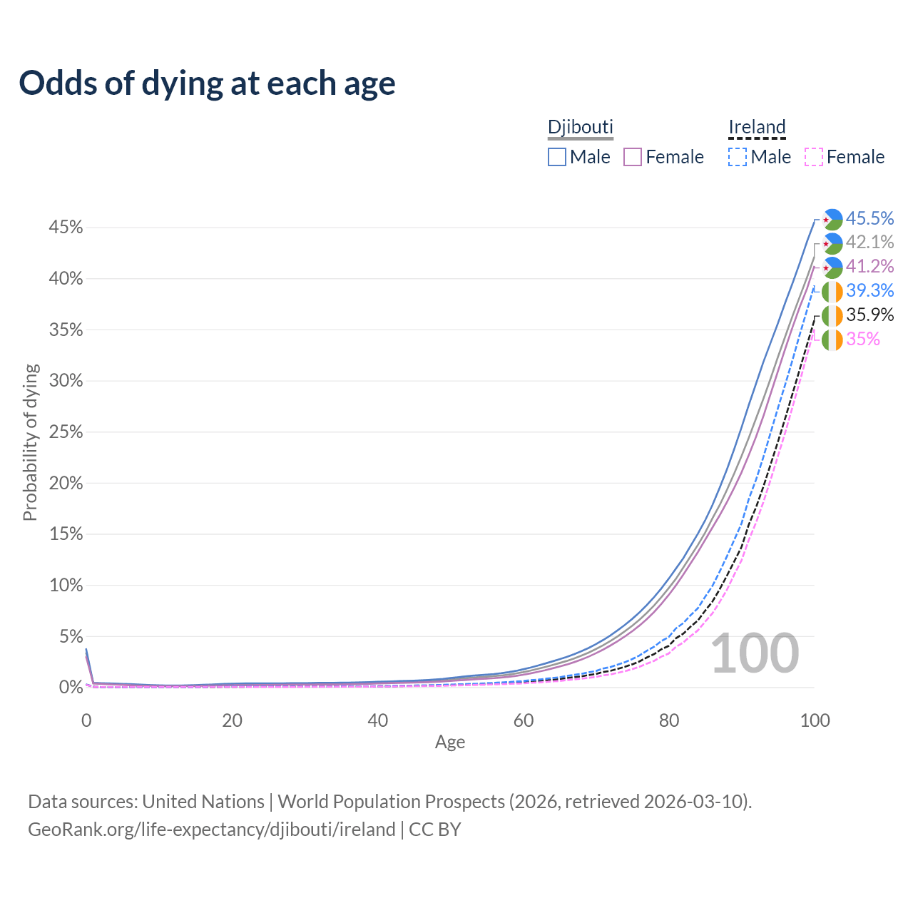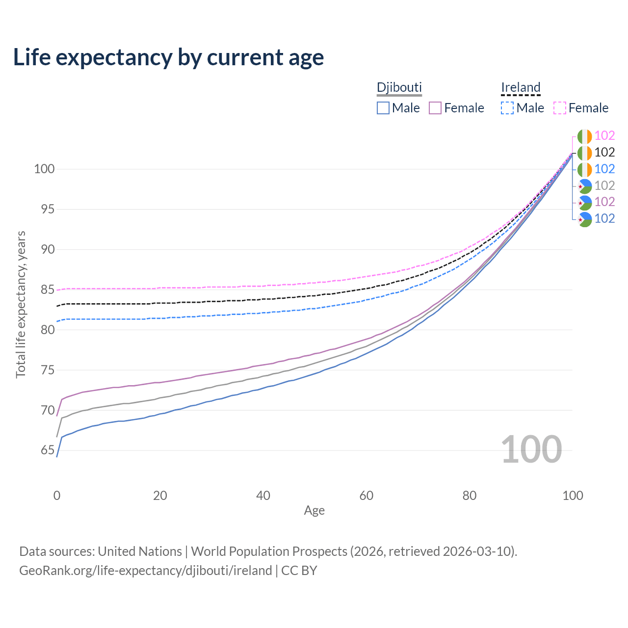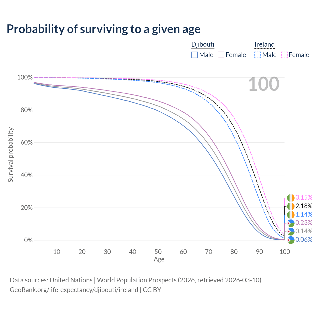 This life expectancy calculator shows the odds of living to 100, 95, 90, and below based on current age for both males and females in Djibouti and Ireland, along with mean and median age of death. The calculations are based on the 2026 life tables (actuarial tables) from the UN World Population Prospects.