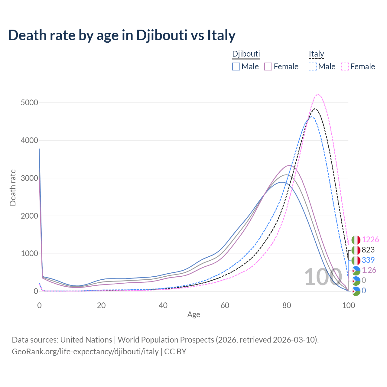 In Djibouti, the most common age of death is 0, compared to 89 in Italy. The median age of death is 73.7 in Djibouti and 86.9 in Italy, meaning only half of each cohort is expected to live past that age.