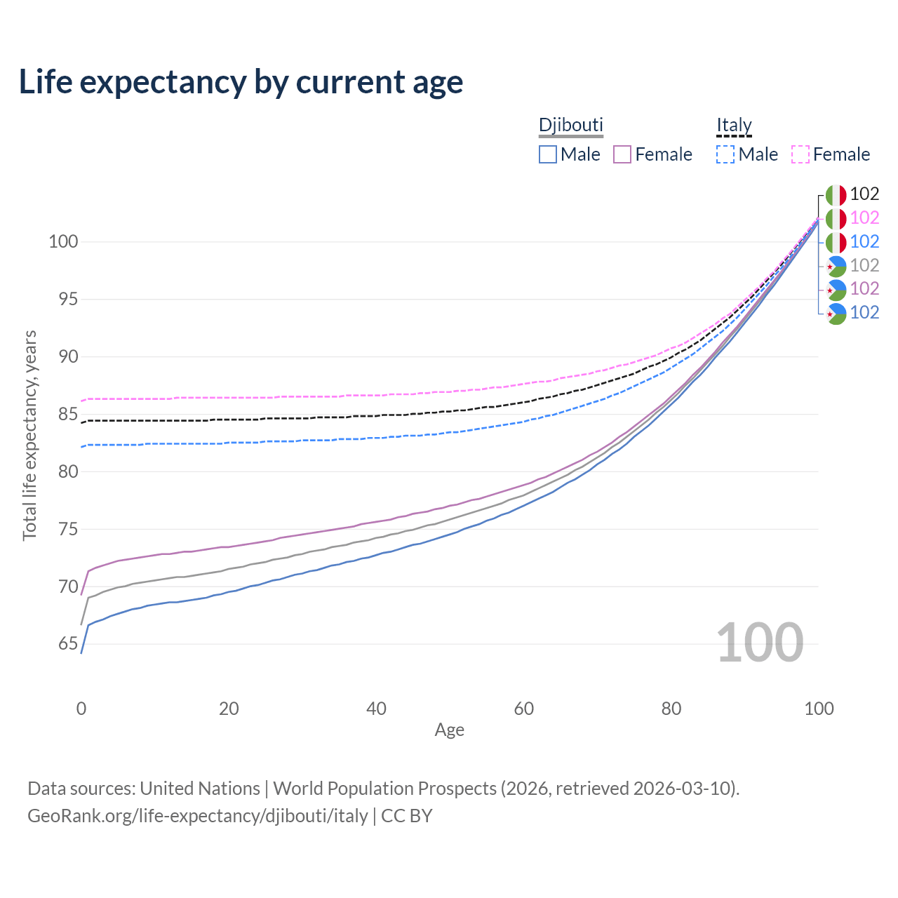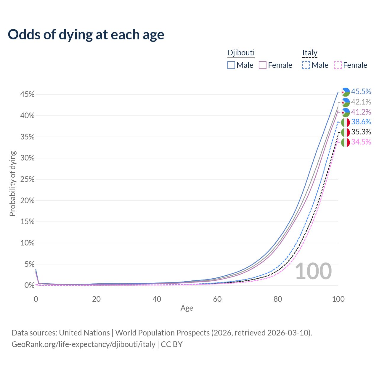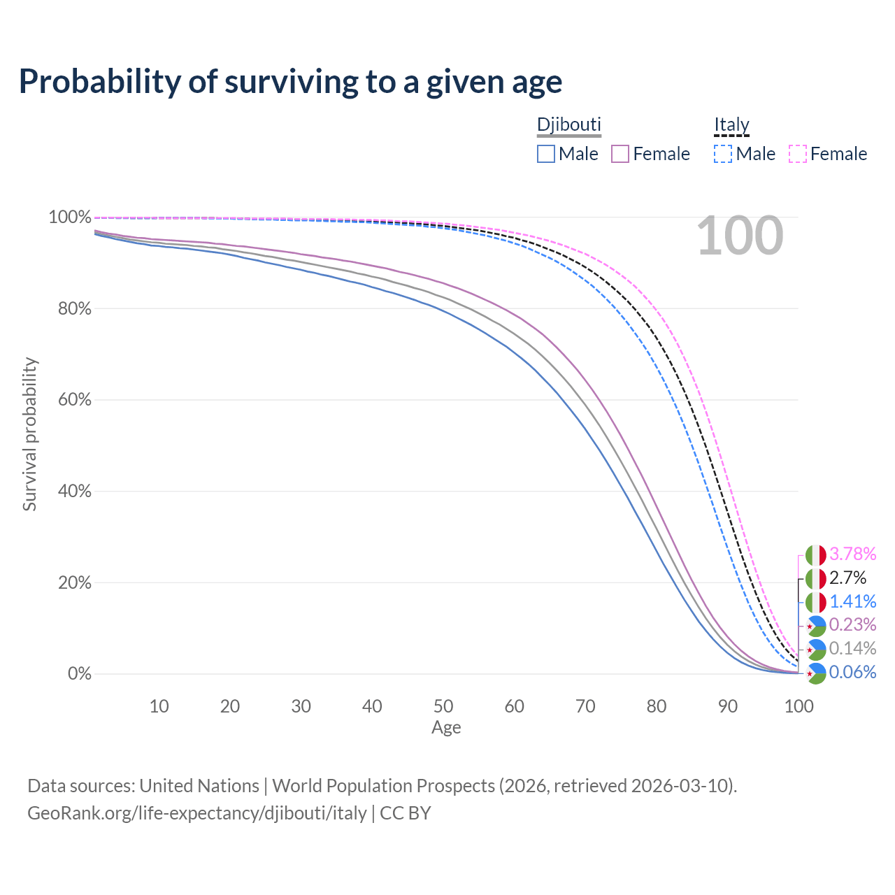 This life expectancy calculator shows the odds of living to 100, 95, 90, and below based on current age for both males and females in Djibouti and Italy, along with mean and median age of death. The calculations are based on the 2026 life tables (actuarial tables) from the UN World Population Prospects.