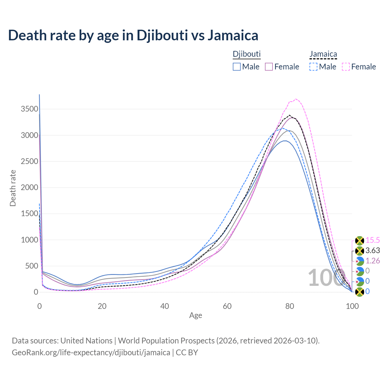 In Djibouti, the most common age of death is 0, compared to 80 in Jamaica. The median age of death is 73.7 in Djibouti and 75.7 in Jamaica, meaning only half of each cohort is expected to live past that age.