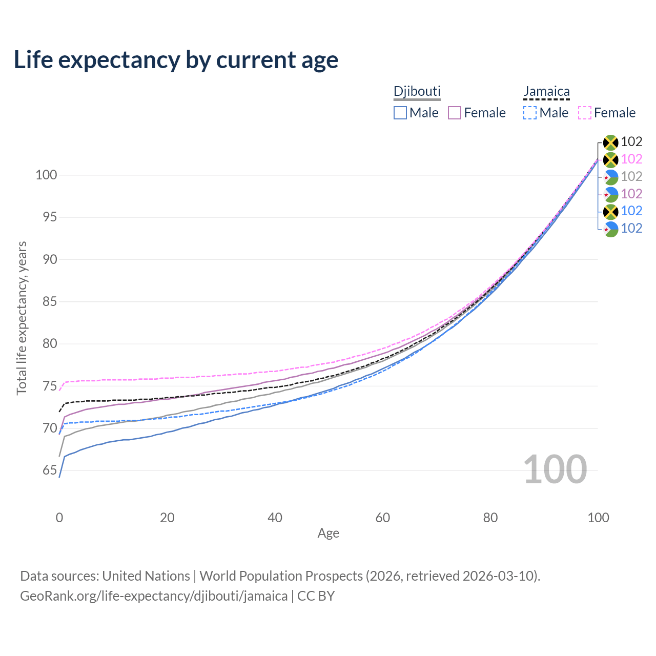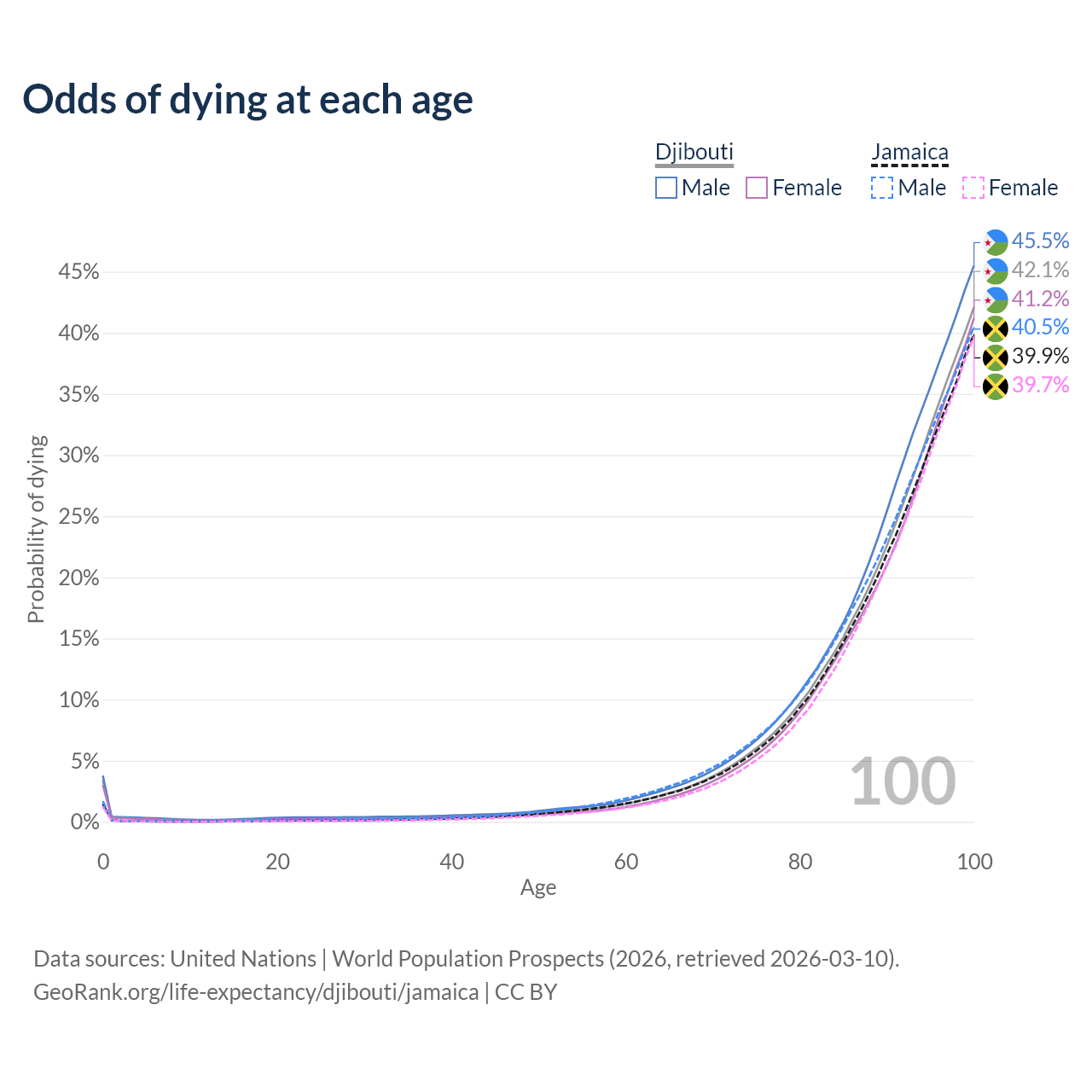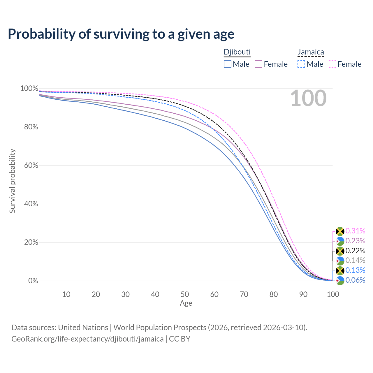 This life expectancy calculator shows the odds of living to 100, 95, 90, and below based on current age for both males and females in Djibouti and Jamaica, along with mean and median age of death. The calculations are based on the 2026 life tables (actuarial tables) from the UN World Population Prospects.