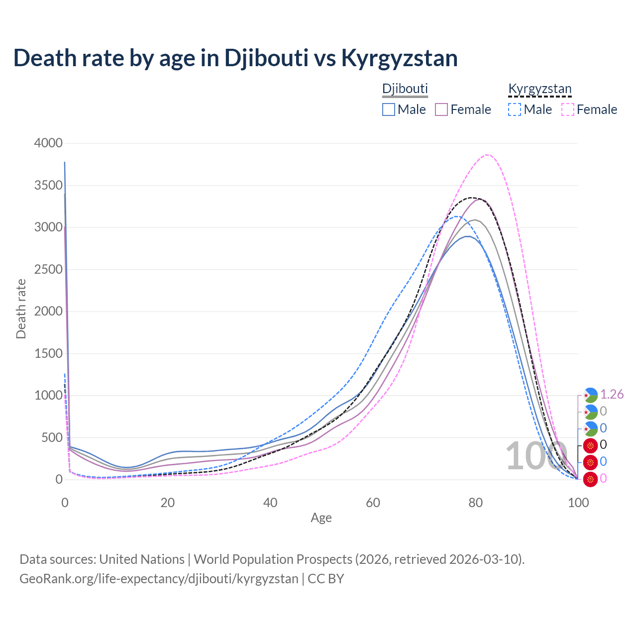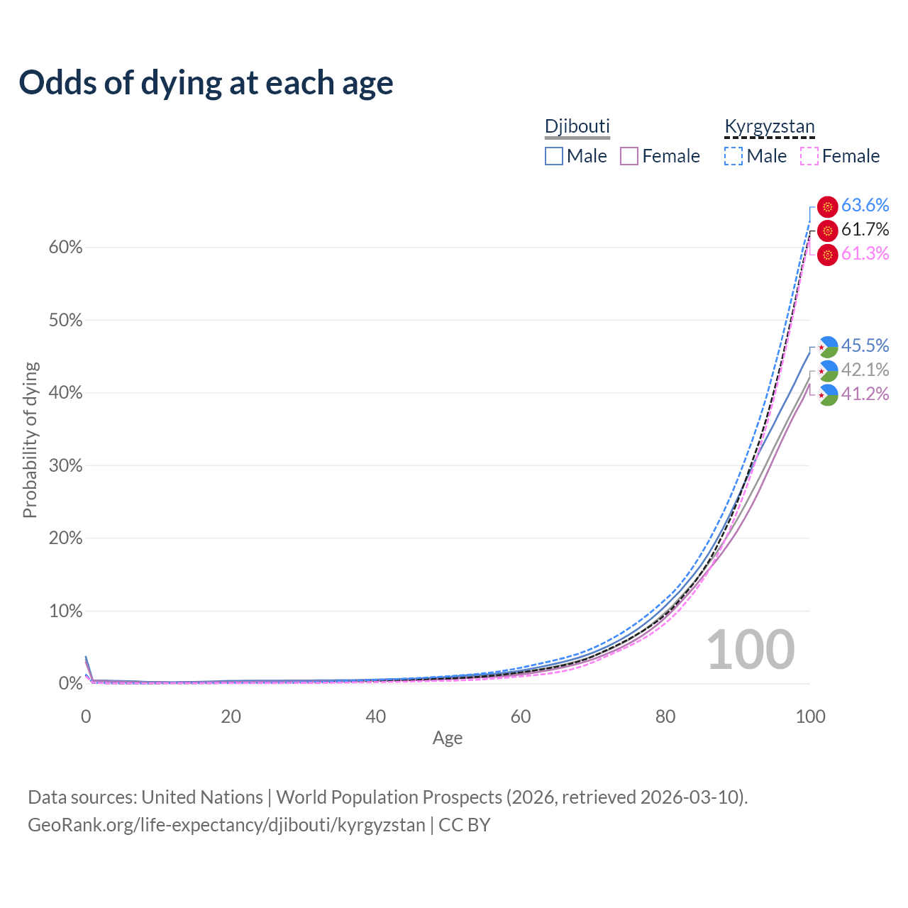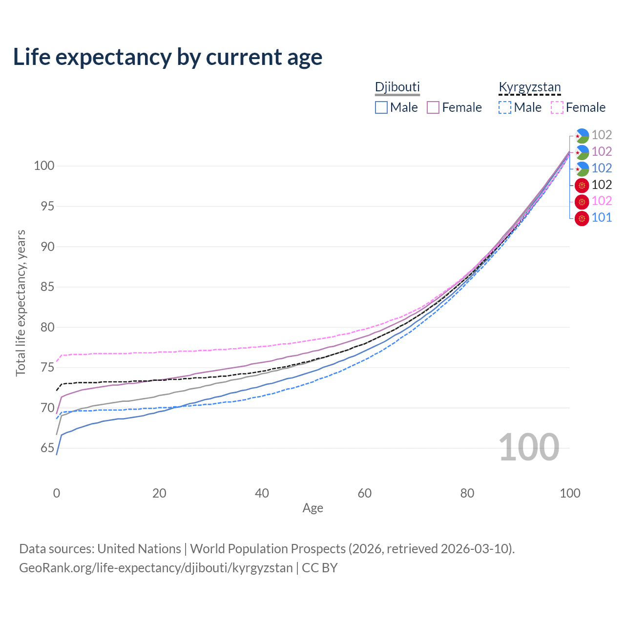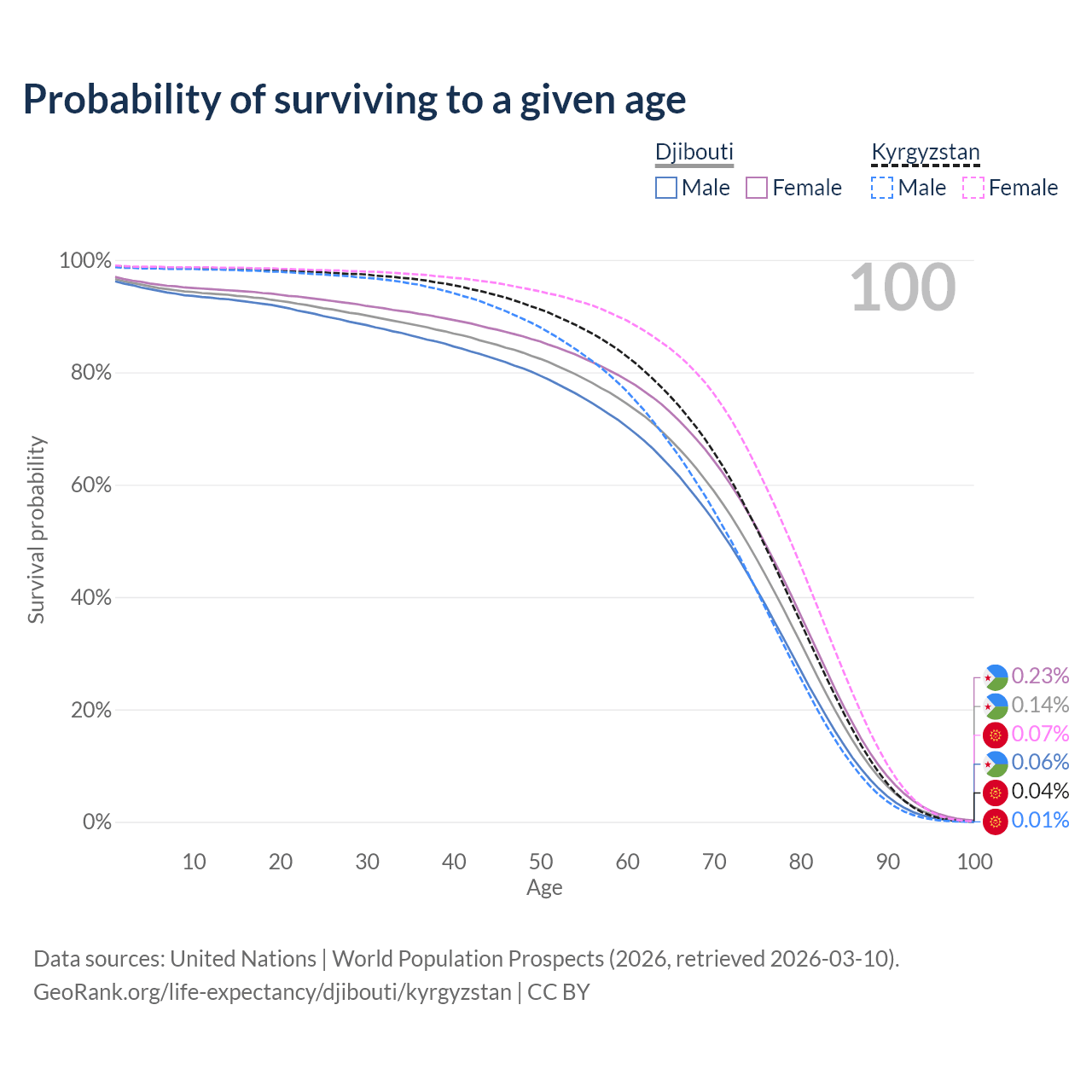 This life expectancy calculator shows the odds of living to 100, 95, 90, and below based on current age for both males and females in Djibouti and Kyrgyzstan, along with mean and median age of death. The calculations are based on the 2026 life tables (actuarial tables) from the UN World Population Prospects.