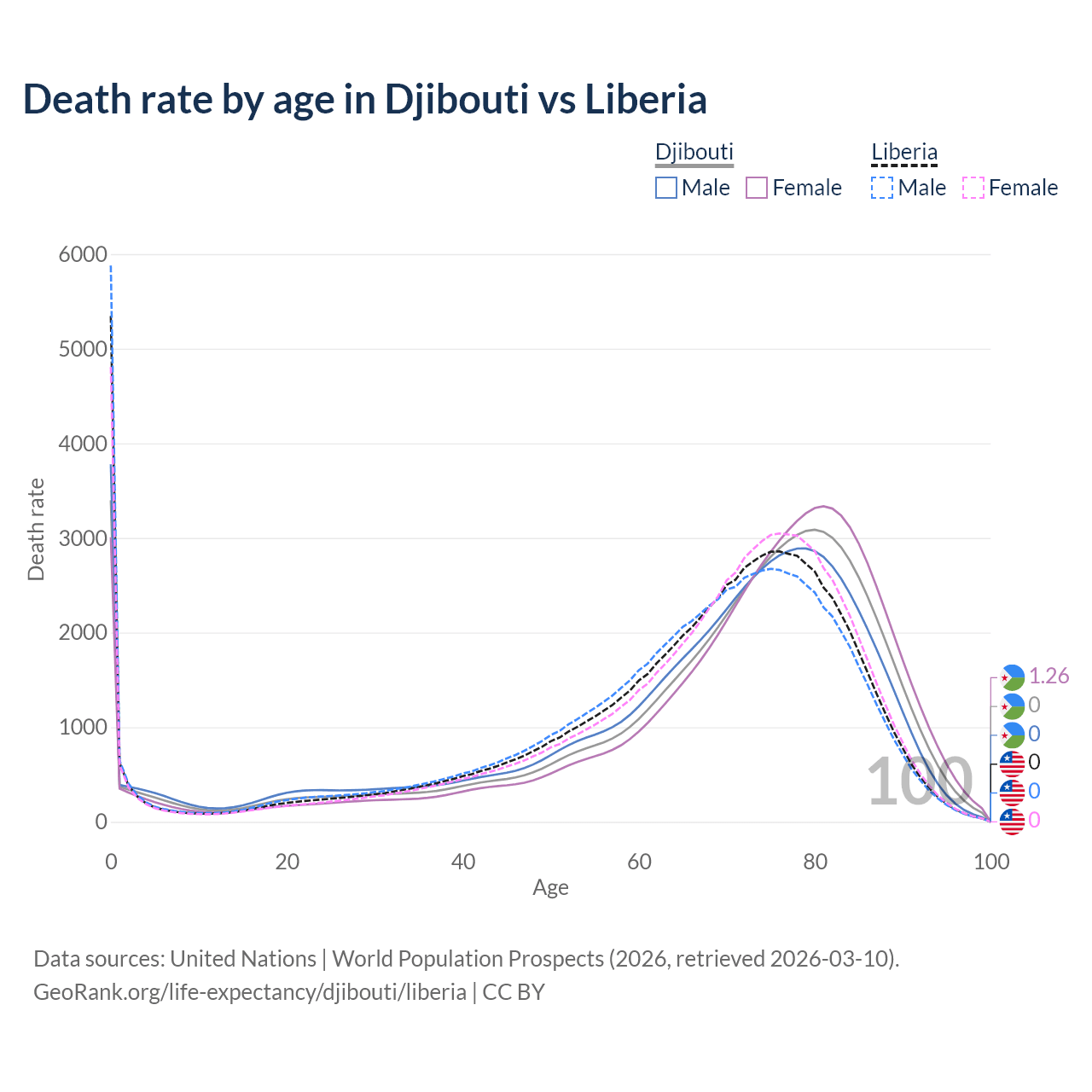 In Djibouti, the most common age of death is 0, compared to 0 in Liberia. The median age of death is 73.7 in Djibouti and 69.6 in Liberia, meaning only half of each cohort is expected to live past that age.
