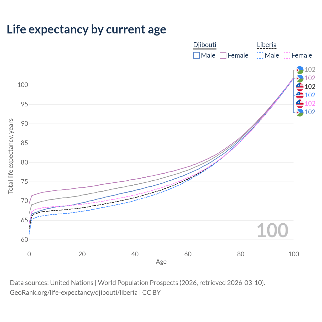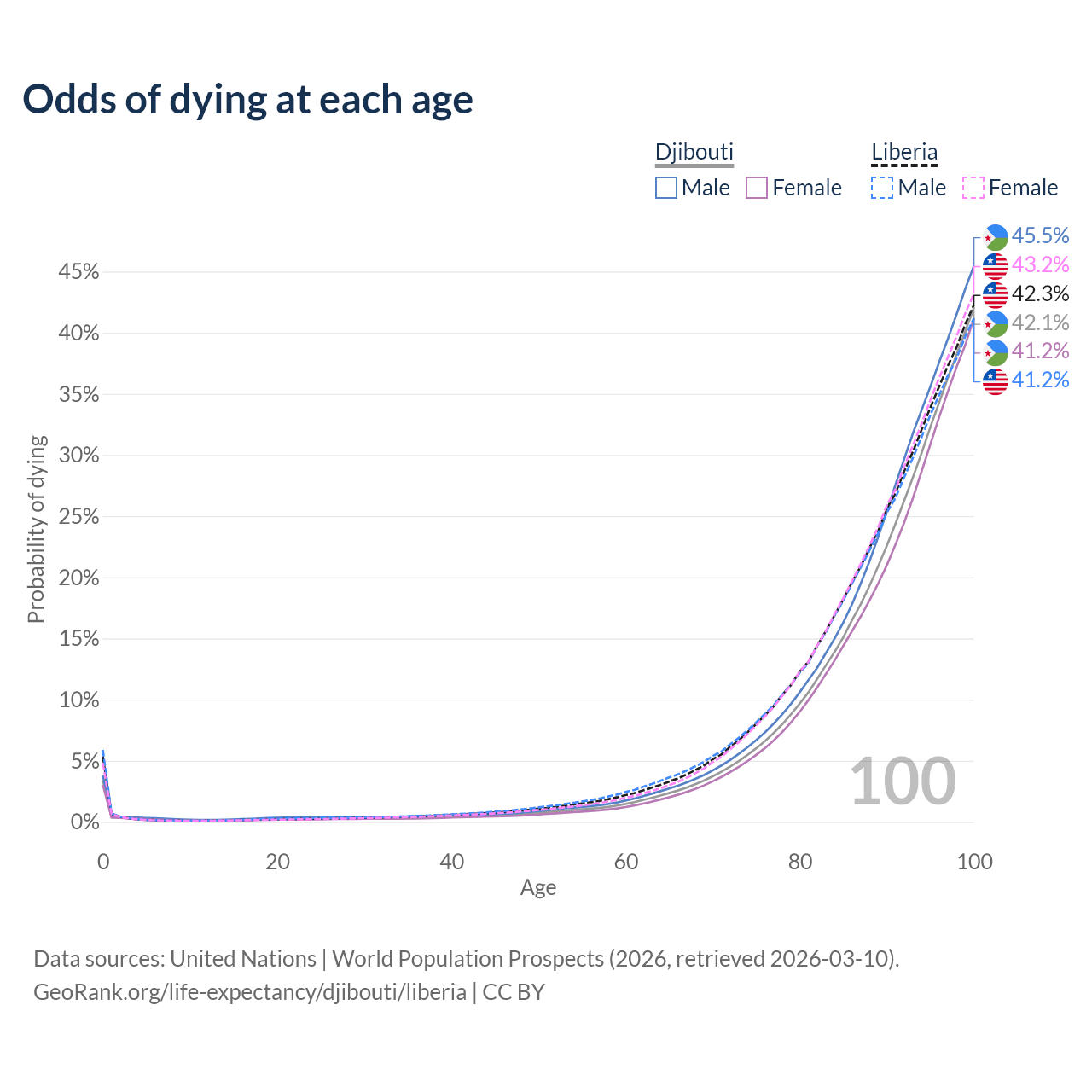 This life expectancy calculator shows the odds of living to 100, 95, 90, and below based on current age for both males and females in Djibouti and Liberia, along with mean and median age of death. The calculations are based on the 2026 life tables (actuarial tables) from the UN World Population Prospects.
