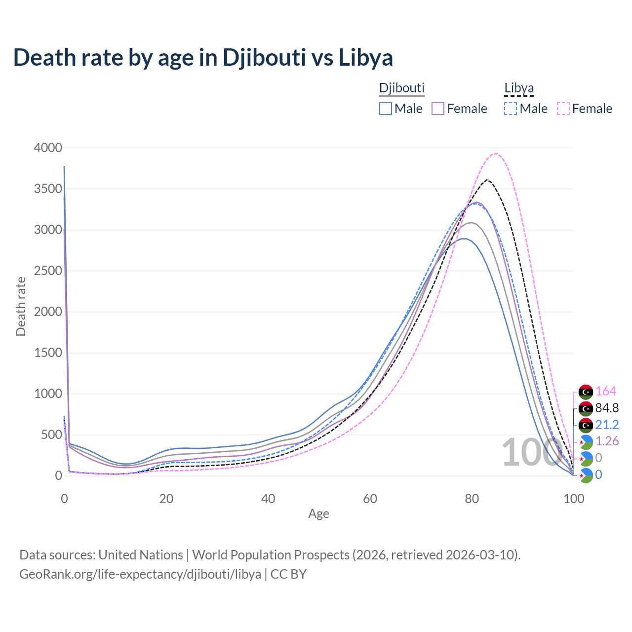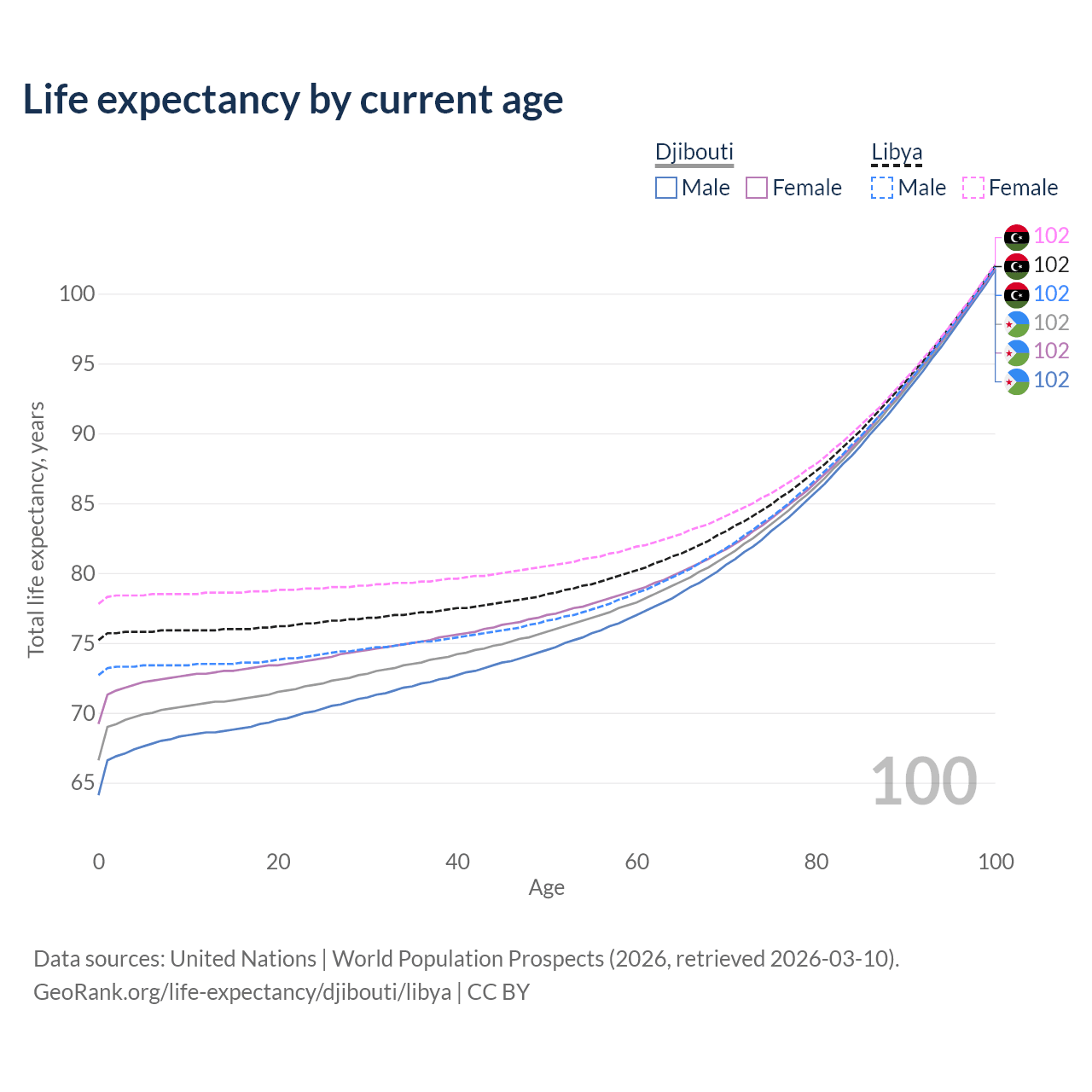This life expectancy calculator shows the odds of living to 100, 95, 90, and below based on current age for both males and females in Djibouti and Libya, along with mean and median age of death. The calculations are based on the 2026 life tables (actuarial tables) from the UN World Population Prospects.
