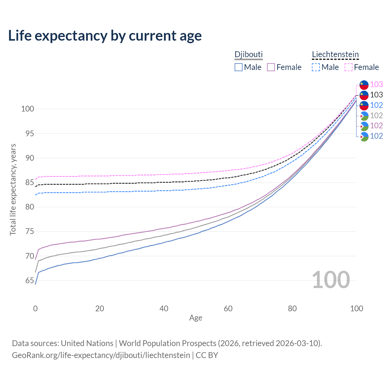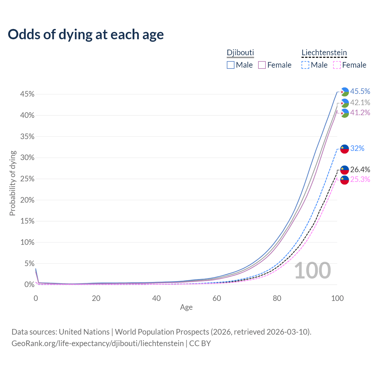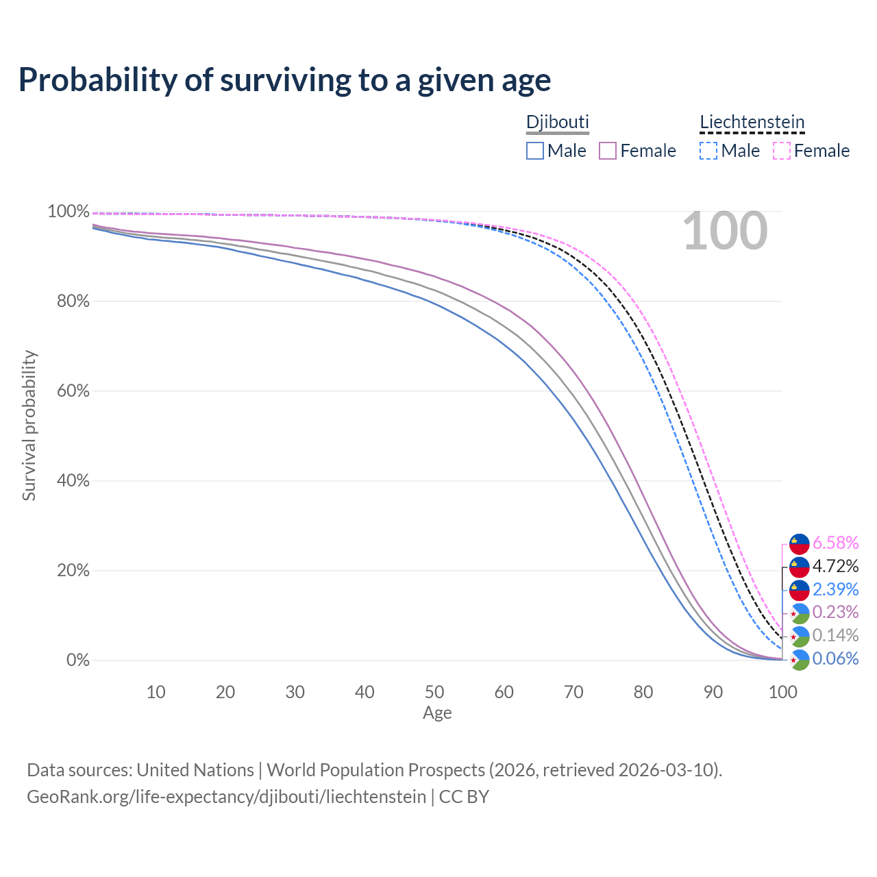 This life expectancy calculator shows the odds of living to 100, 95, 90, and below based on current age for both males and females in Djibouti and Liechtenstein, along with mean and median age of death. The calculations are based on the 2026 life tables (actuarial tables) from the UN World Population Prospects.