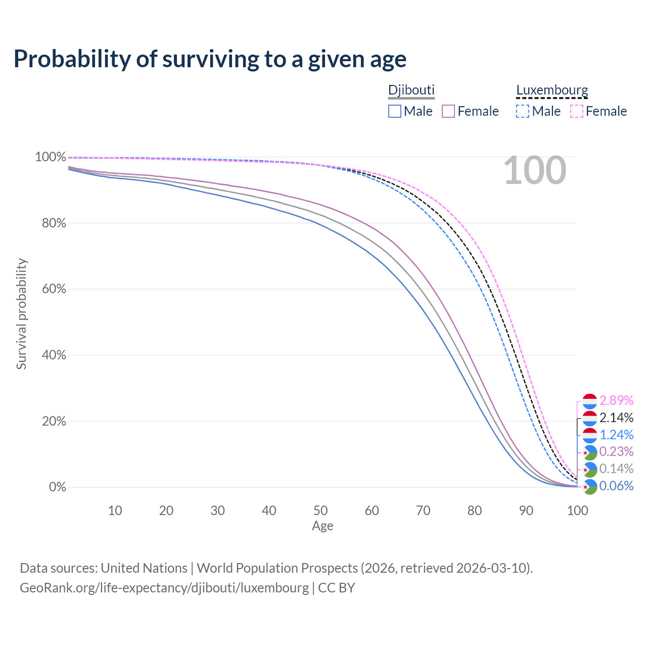 This life expectancy calculator shows the odds of living to 100, 95, 90, and below based on current age for both males and females in Djibouti and Luxembourg, along with mean and median age of death. The calculations are based on the 2026 life tables (actuarial tables) from the UN World Population Prospects.