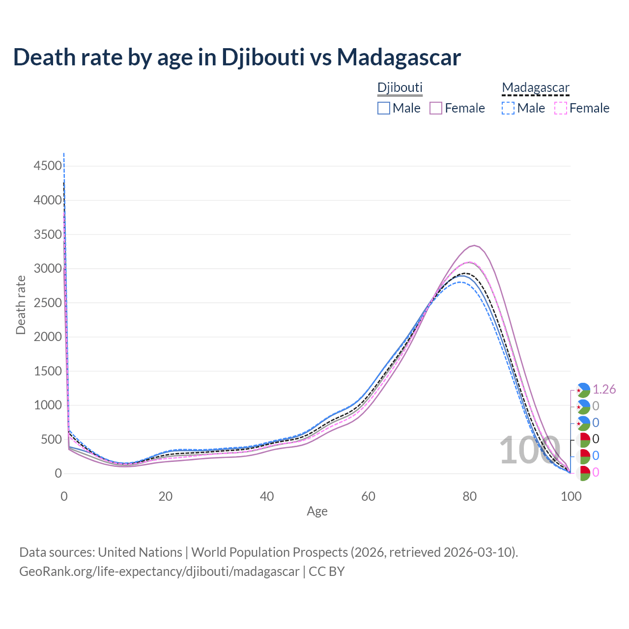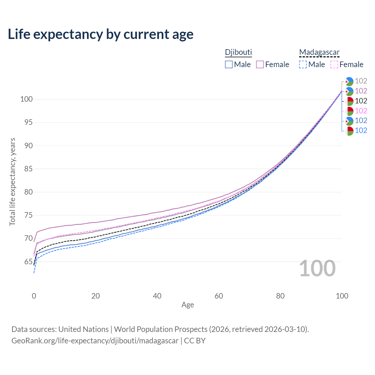 This life expectancy calculator shows the odds of living to 100, 95, 90, and below based on current age for both males and females in Djibouti and Madagascar, along with mean and median age of death. The calculations are based on the 2026 life tables (actuarial tables) from the UN World Population Prospects.
