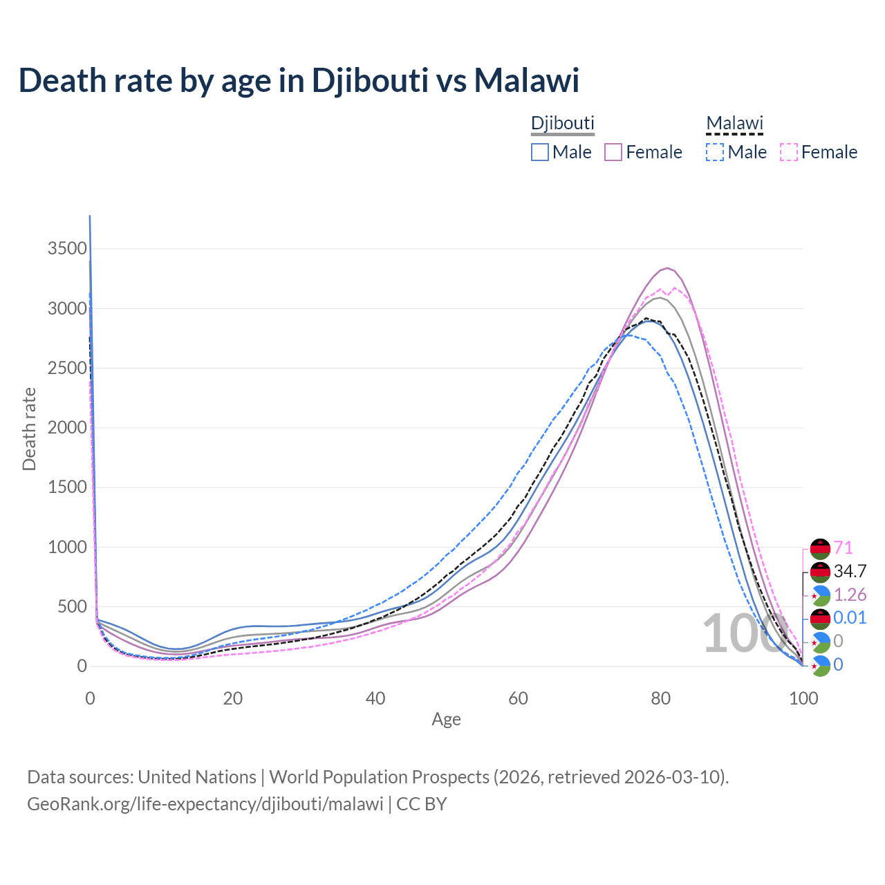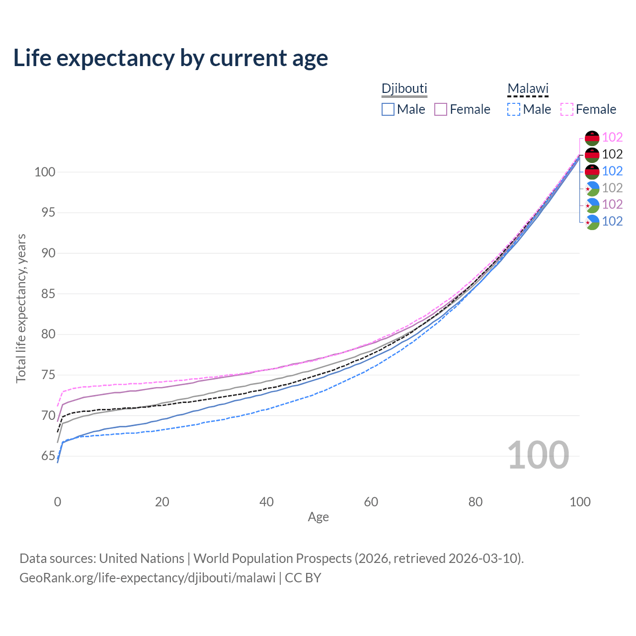 This life expectancy calculator shows the odds of living to 100, 95, 90, and below based on current age for both males and females in Djibouti and Malawi, along with mean and median age of death. The calculations are based on the 2026 life tables (actuarial tables) from the UN World Population Prospects.