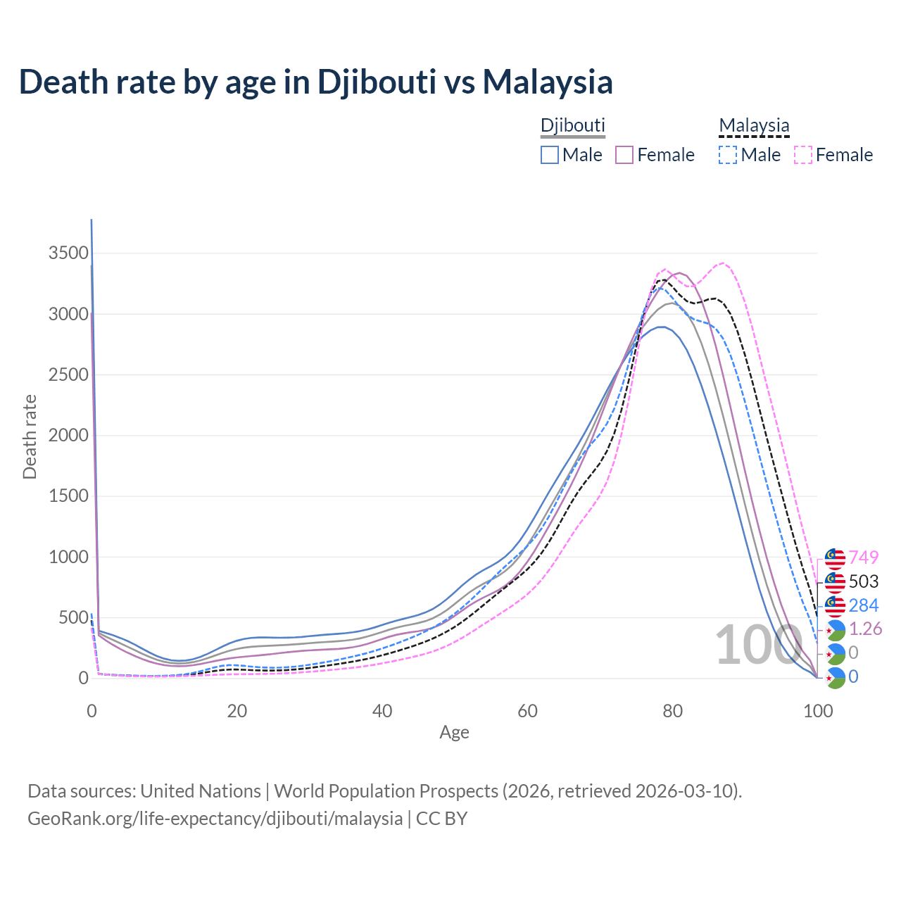 In Djibouti, the most common age of death is 0, compared to 79 in Malaysia. The median age of death is 73.7 in Djibouti and 79.8 in Malaysia, meaning only half of each cohort is expected to live past that age.