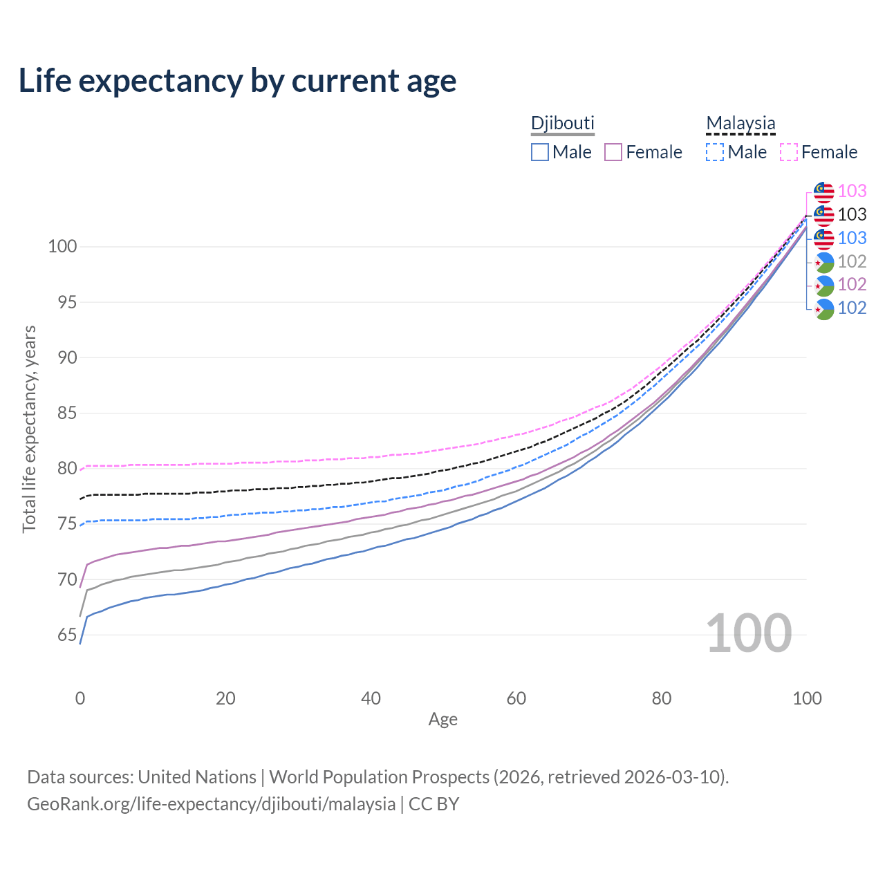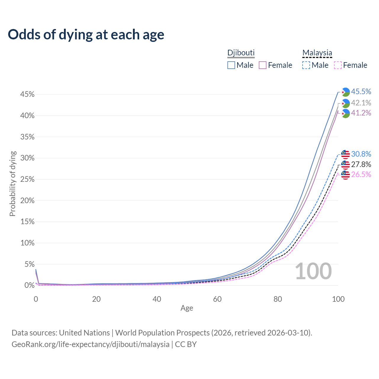 This life expectancy calculator shows the odds of living to 100, 95, 90, and below based on current age for both males and females in Djibouti and Malaysia, along with mean and median age of death. The calculations are based on the 2026 life tables (actuarial tables) from the UN World Population Prospects.